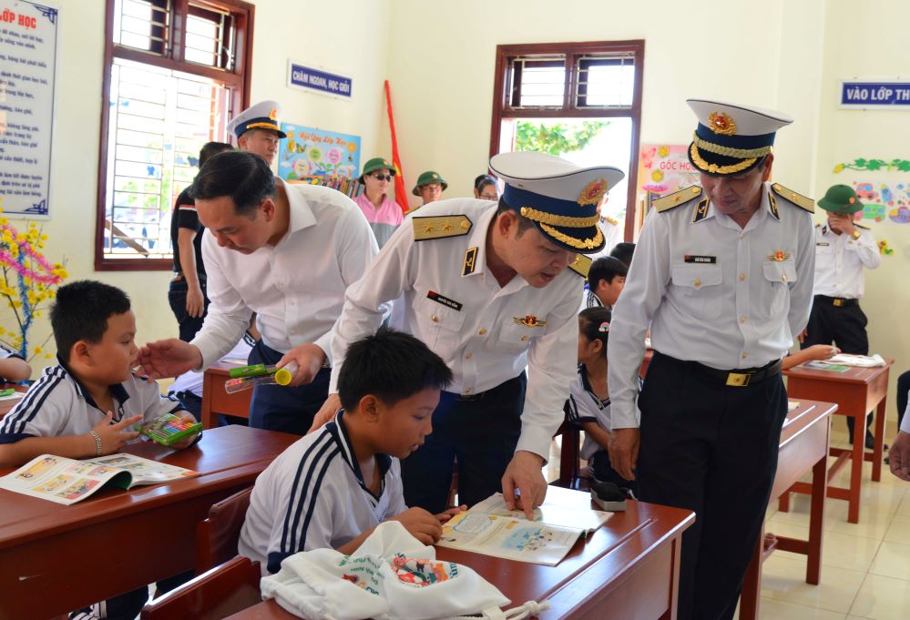 Chính ủy Hải quân và lãnh đạo đoàn công tác thăm, động viên các cháu học sinh Trường tiểu học Đá Tây A