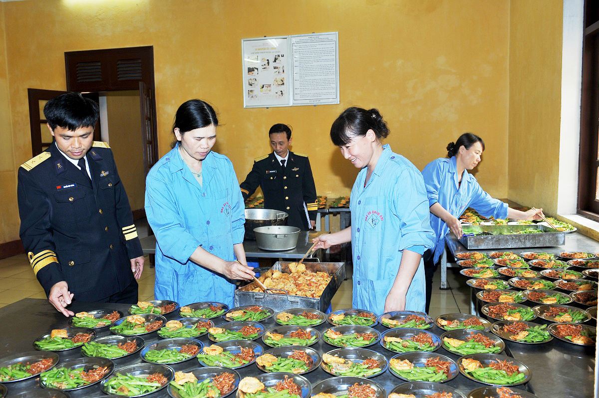 Trên bàn ăn của bộ đội tàu Lữ đoàn 172, Vùng 3 Hải quân, bên cạnh các món ăn chung là cơm nóng và canh cá nấu chua thì khẩu phần của mỗi cán bộ, chiến sĩ còn có 5 món: Cá biển kho, tôm rang me, trứng cút chiên xì dầu, rau muống xào tỏi và thịt lợn xông khói.