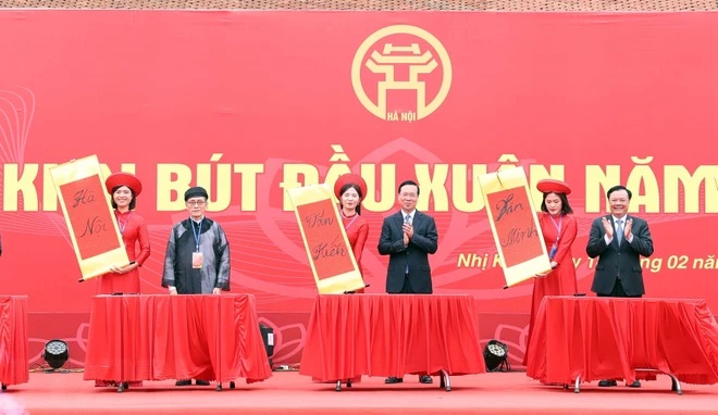 Chủ tịch nước cũng dự lễ Khai bút đầu xuân với chủ đề: Thủ đô Hà Nội: “văn hiến-văn minh-hiện đại” và thực hiện nghi thức khai bút đầu xuân.