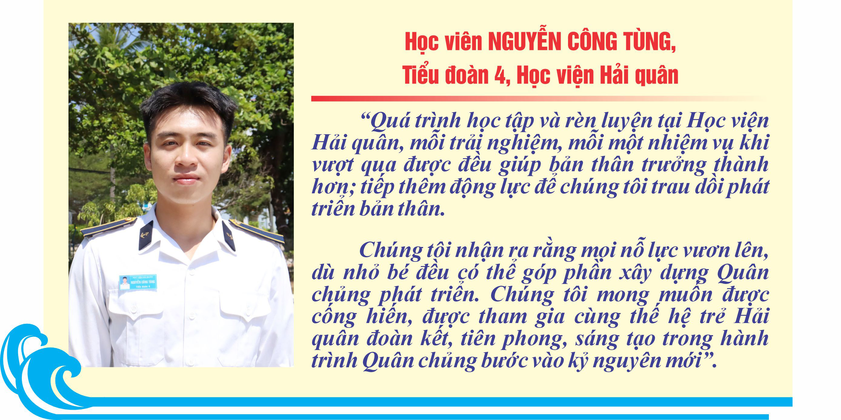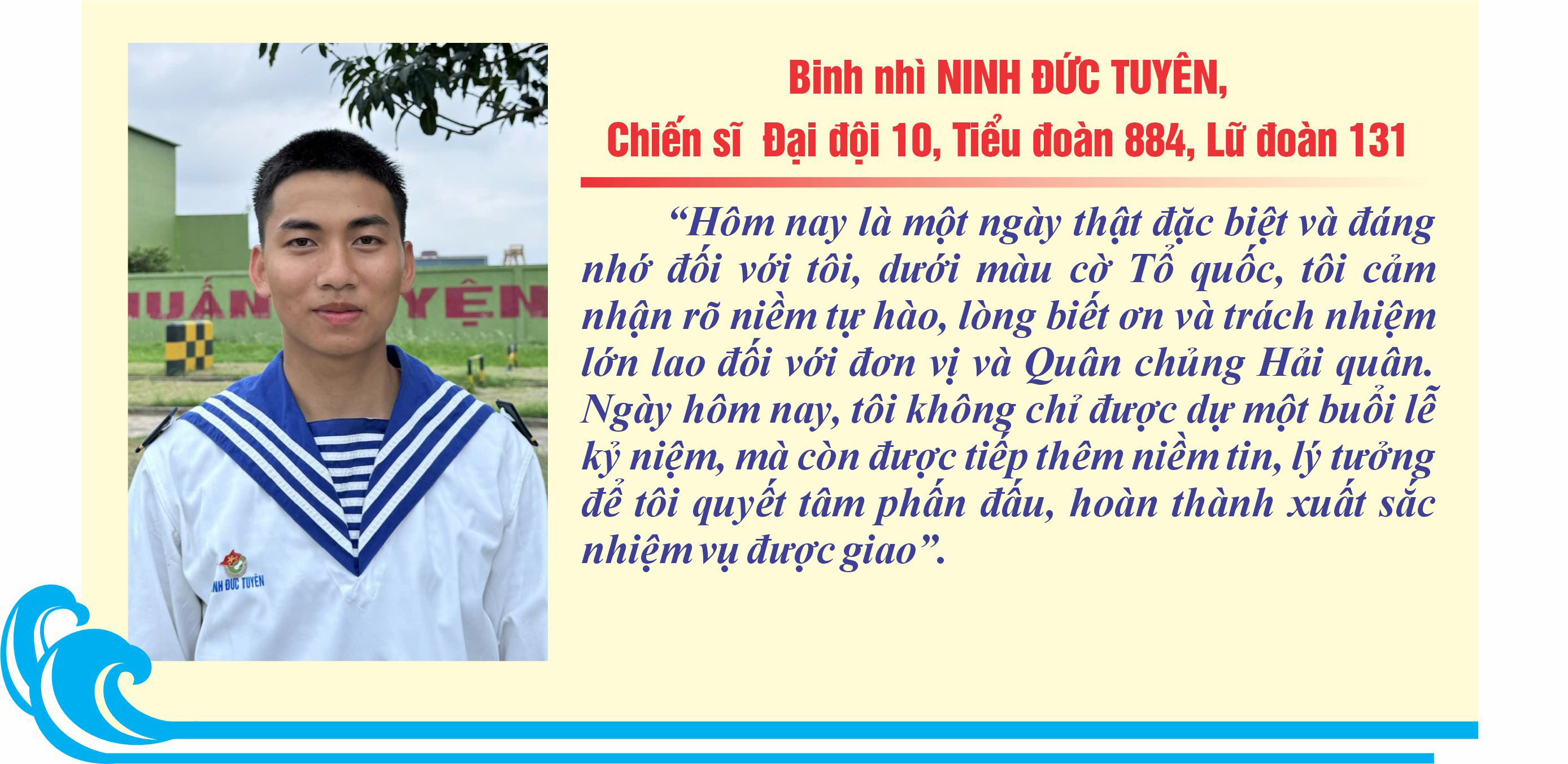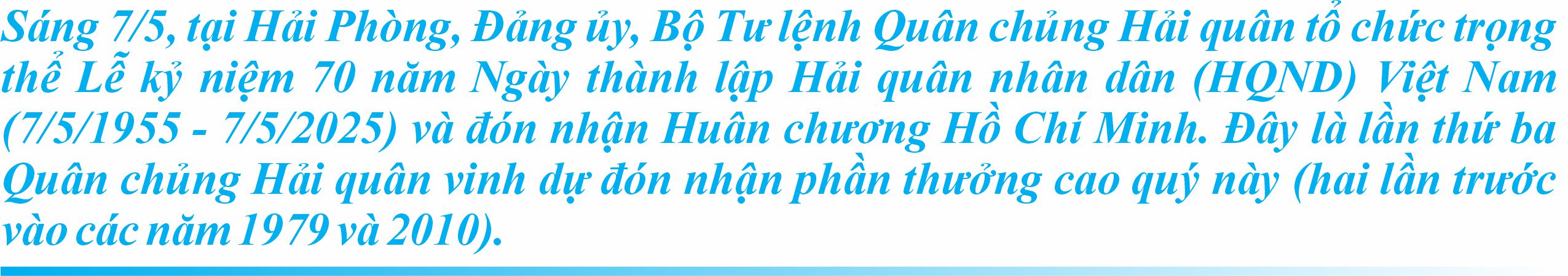 Quân chủng Hải quân kính mong tiếp tục nhận được sự quan tâm lãnh đạo, chỉ đạo của Đảng, Nhà nước, Quân ủy Trung ương, Bộ Quốc phòng; sự quan tâm, giúp đỡ, đồng hành, ủng hộ từ các cấp, các ngành, các địa phương, đơn vị bạn; sự yêu thương, đùm bọc, giúp đỡ của đồng bào, chiến sĩ cả nước để HQND Việt Nam tiếp tục hoàn thành tốt trọng trách mà Đảng, Nhà nước, Nhân dân và Quân đội tin tưởng giao phó.