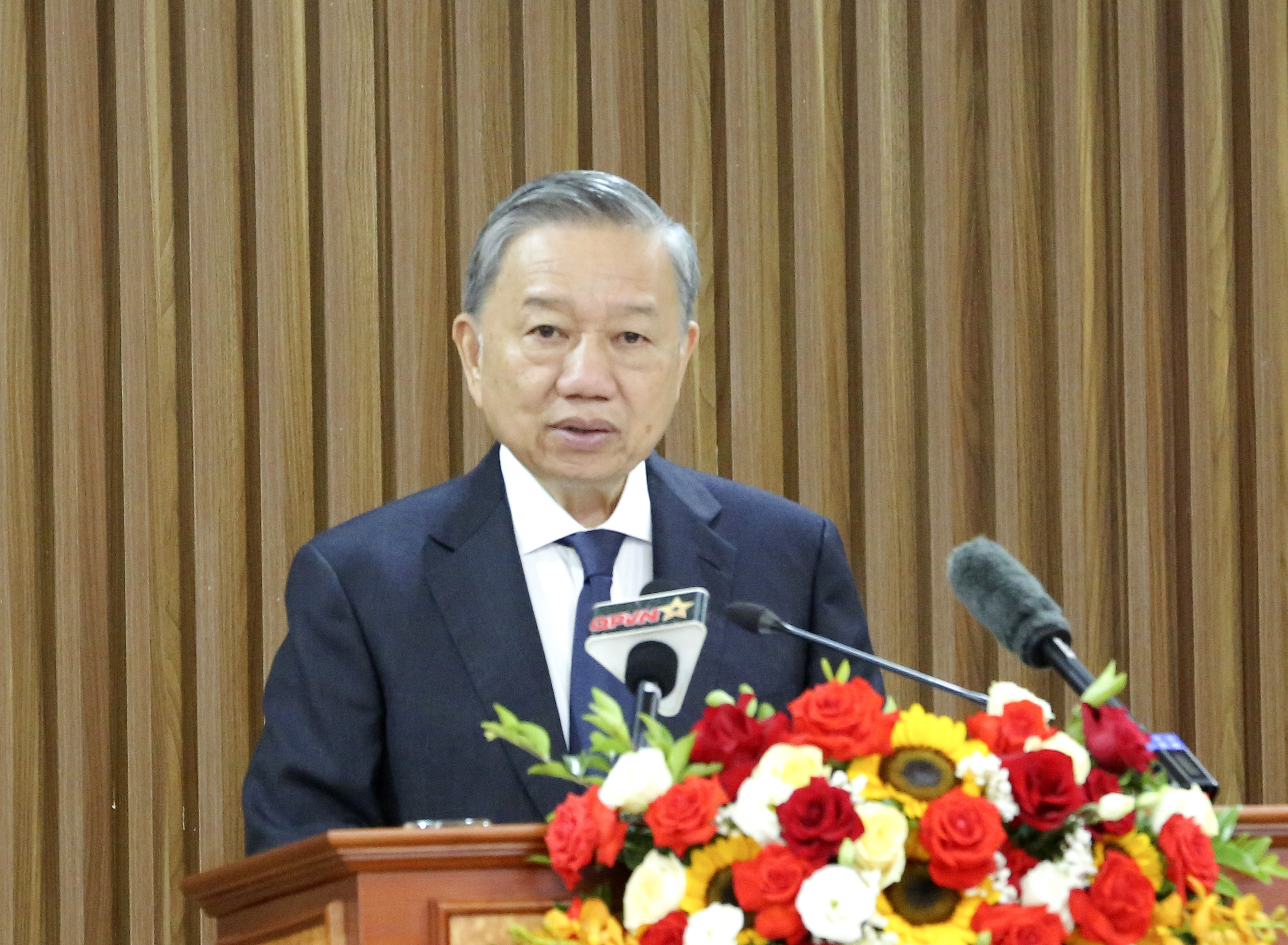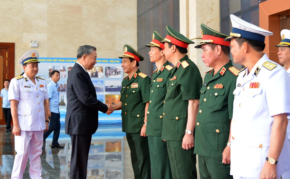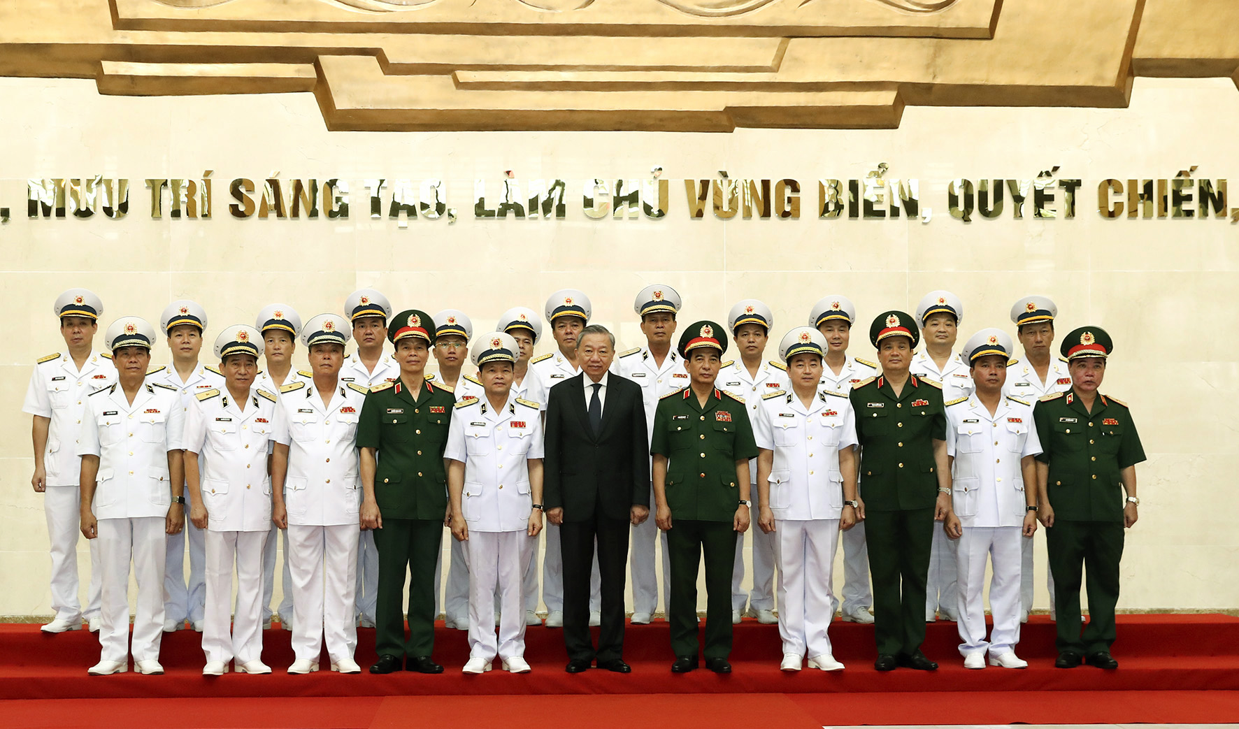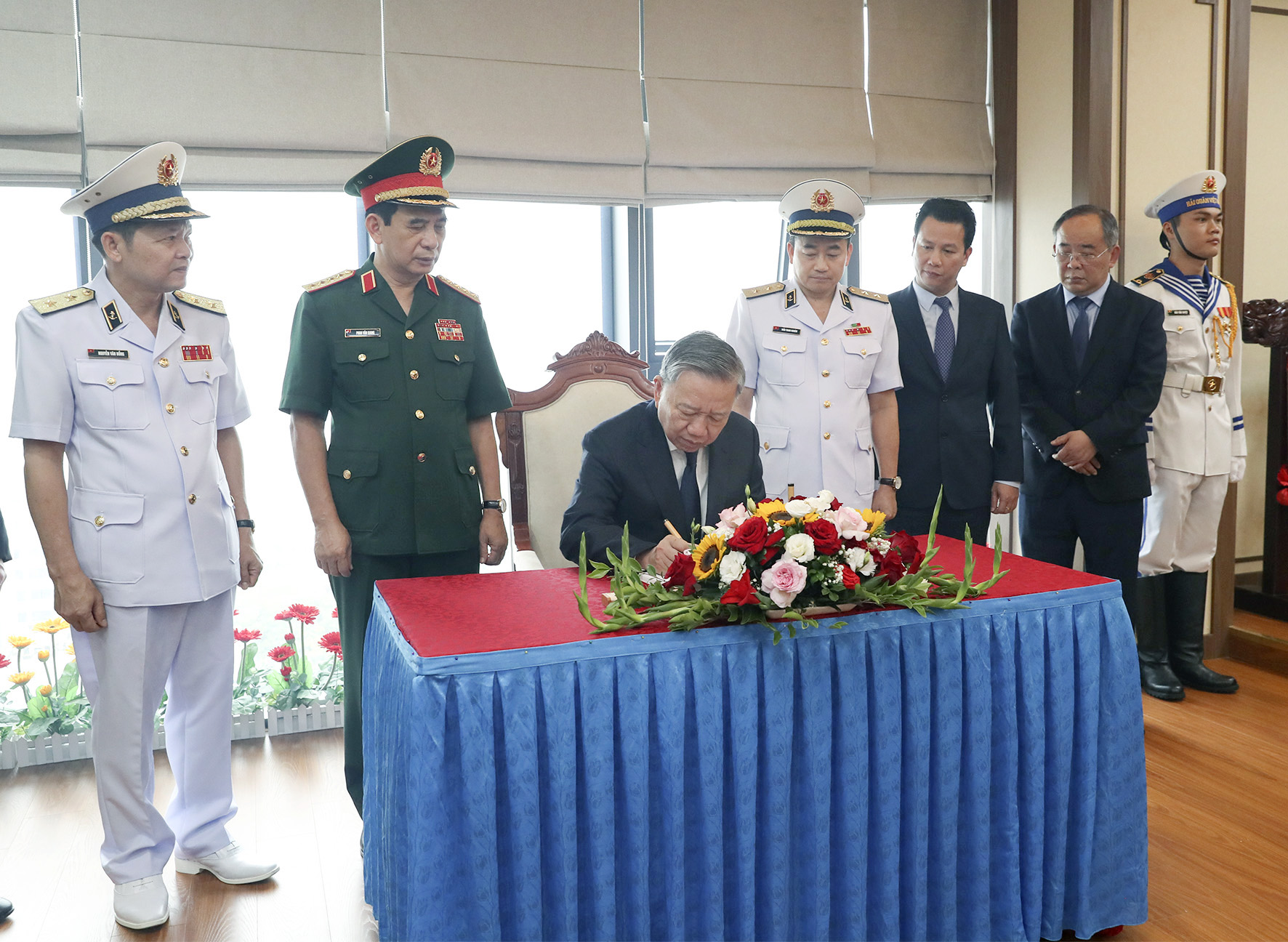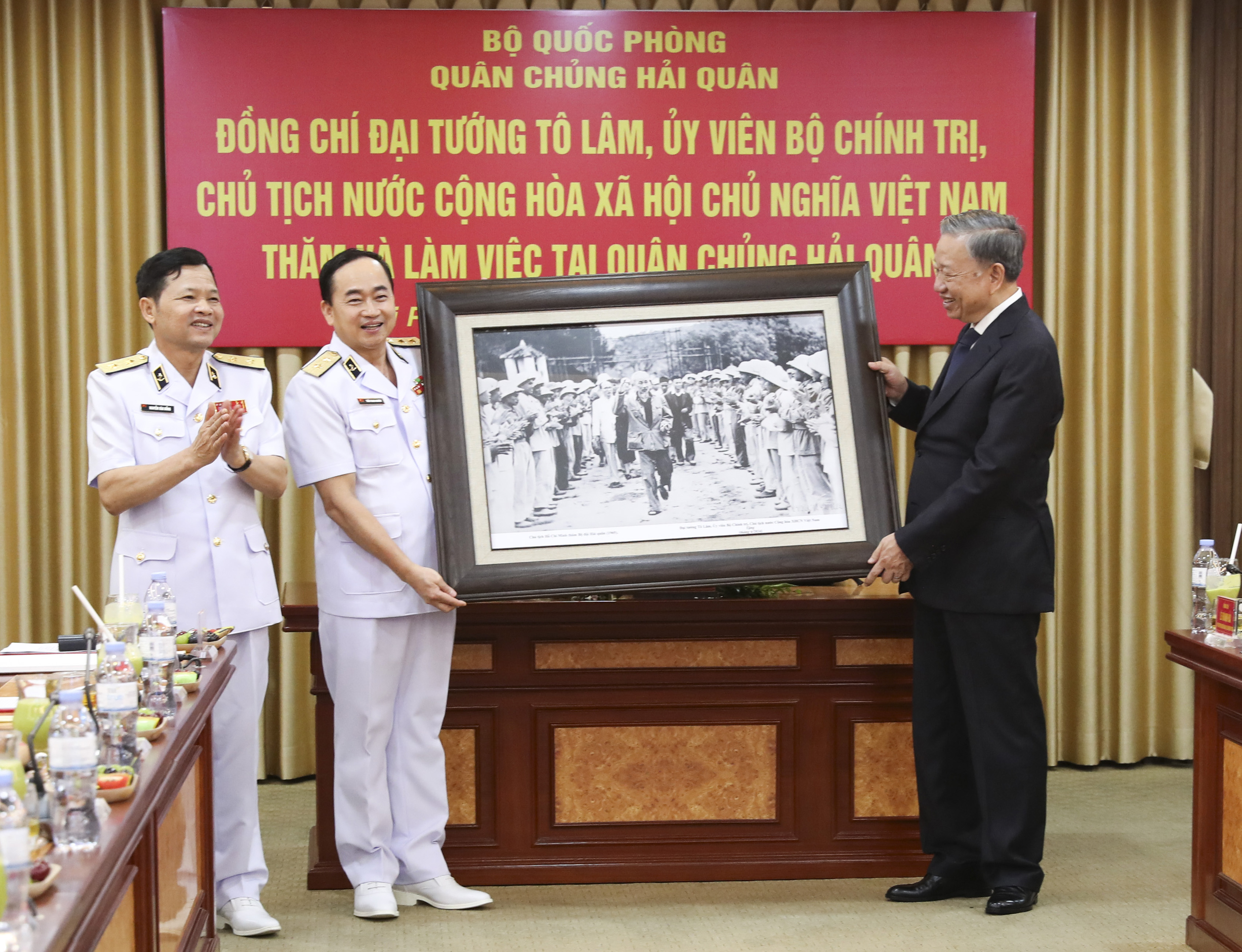 Bày tỏ vui mừng đến thăm và làm việc với Quân chủng Hải quân, Chủ tịch nước Tô Lâm đã chuyển lời thăm hỏi, tình cảm và lời chúc mừng tốt đẹp nhất của Tổng Bí thư Nguyễn Phú Trọng đến toàn thể cán bộ, chiến sĩ Hải quân.