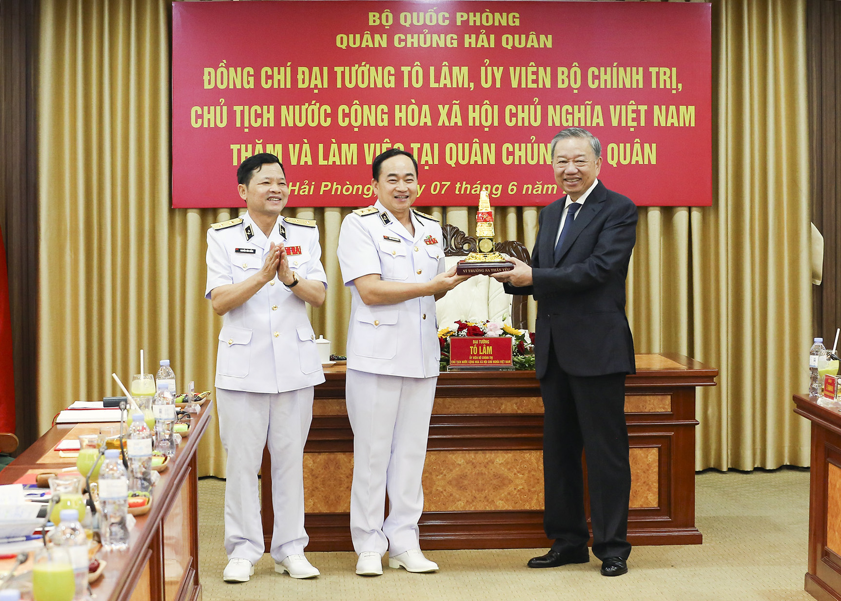 Sáng 7/6, tại TP. Hải Phòng, đồng chí Tô Lâm, Ủy viên Bộ Chính trị, Chủ tịch nước Cộng hòa XHCN Việt Nam đến thăm và làm việc với Quân chủng Hải quân. Cùng đi với Chủ tịch nước có Đại tướng Phan Văn Giang, Ủy viên Bộ Chính trị, Phó Bí thư Quân ủy Trung ương, Bộ trưởng Bộ Quốc phòng; các đồng chí Ủy viên Trung ương Đảng: Lê Khánh Hải, Chủ nhiệm Văn phòng Chủ tịch nước; Đặng Quốc Khánh, Bộ trưởng Bộ Tài nguyên và Môi trường; lãnh đạo một số cơ quan, đơn vị thuộc Bộ Quốc phòng.