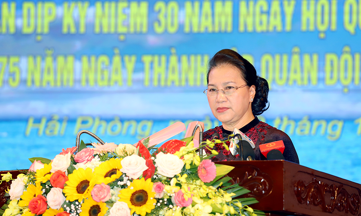 Phát biểu với cán bộ, chiến sĩ Hải quân, Chủ tịch Quốc hội biểu dương những thành tích Quân chủng Hải quân đã đạt được trong thời gian qua và nhấn mạnh: Quân chủng Hải quân cần tiếp tục quán triệt sâu sắc và thực hiện tốt nghị quyết, chỉ thị của Đảng, Nhà nước; của Quân ủy Trung ương, Bộ Quốc phòng, trọng tâm là Nghị quyết Đại hội lần thứ XII của Đảng, Nghị quyết Trung ương 8, Khóa XI về “Chiến lược bảo vệ Tổ quốc trong tình hình mới”, Nghị quyết Trung ương 8, Khóa XII về “Chiến lược phát triển bền vững kinh tế biển Việt Nam đến năm 2030, tầm nhìn đến năm 2045”. Cán bộ, chiến sĩ Hải quân cần tiếp tục đề cao cảnh giác, dự báo đúng tình hình, kịp thời tham mưu với Đảng, Nhà nước, Quân ủy Trung ương và Bộ Quốc phòng kiên quyết, kiên trì xử lý linh hoạt các tình huống từ sớm, từ xa, không để bị động, bất ngờ, bảo vệ vững chắc chủ quyền biển, đảo của ta, xây dựng vùng biển hòa bình, ổn định…