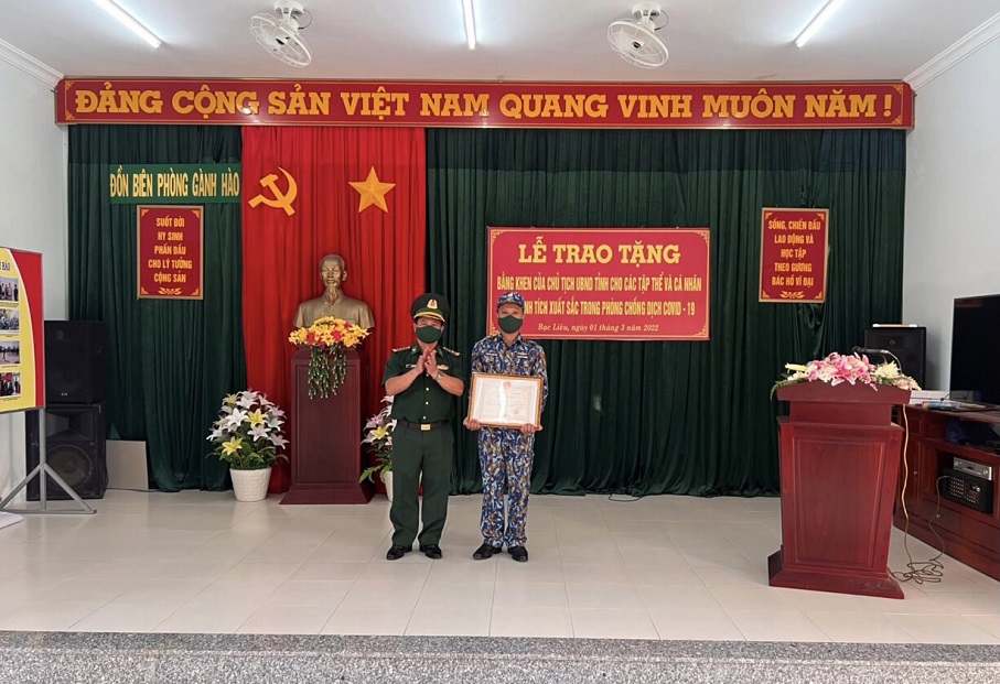 Chiều 1/3, thừa ủy quyền của Chủ tịch UBND tỉnh Bạc Liêu, Bộ Chỉ huy Bộ đội Biên phòng tỉnh Bạc Liêu tổ chức Lễ trao tặng Bằng khen của Chủ tịch UBND tỉnh cho các tập thể và cá nhân có thành tích xuất sắc trong thực hiện nhiệm vụ phòng, chống dịch Covid-19. Đại tá Lê Văn Binh, Phó Chỉ huy trưởng, Tham mưu trưởng Bộ Chỉ huy Bộ đội Biên phòng tỉnh Bạc Liêu chủ trì.