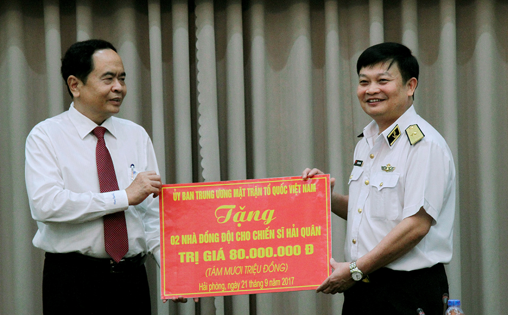 Nhân dịp này, Chủ tịch UBTW MTTQ Việt Nam Trần Thanh Mẫn đã trao 80 triệu đồng để xây dựng 2 căn nhà đồng đội cho cán bộ, chiến sĩ Hải quân có hoàn cảnh khó khăn.