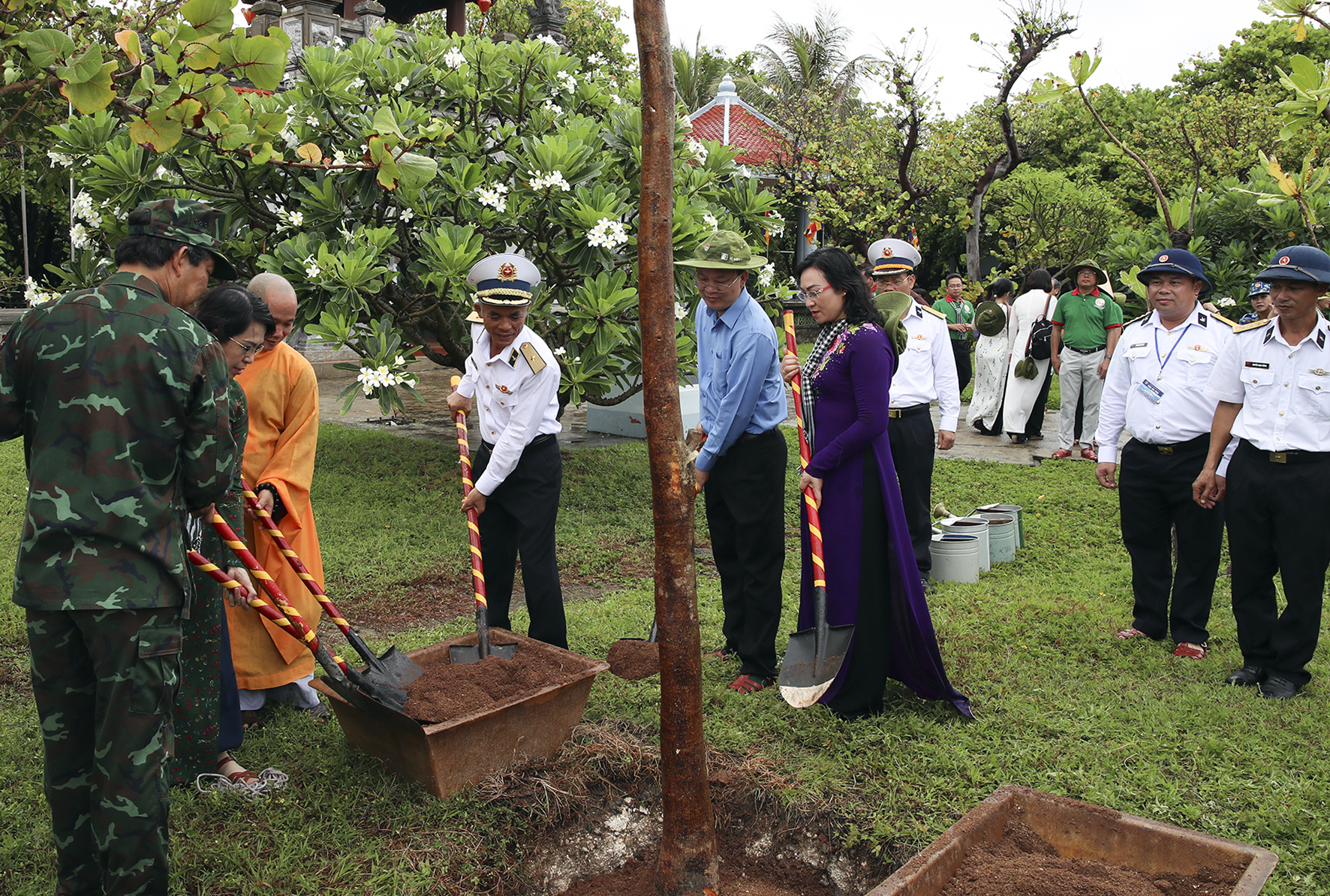 Thủ trưởng Bộ Tư lệnh Hải quân và đoàn công tác TP. Hồ Chí Minh trồng cây lưu niệm tại đảo Trường Sa. Ảnh: Hải Hà