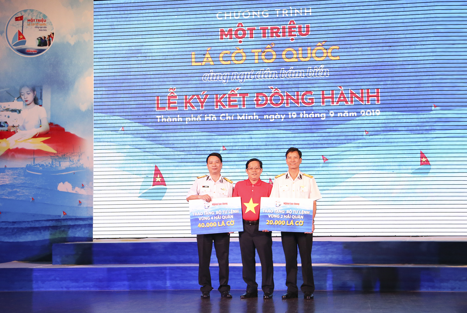 Tại buổi ký kết, các đơn vị, doanh nghiệp đã ký kết phối hợp hoạt động với Báo Người lao động về thực hiện Chương trình “Một triệu lá cờ Tổ quốc cùng ngư dân bám biển”. Báo Người lao động đã trao 60.000 lá cờ Tổ quốc cho Vùng 2 và Vùng 4 Hải quân; 1.000 lá cờ Tổ quốc cho ngư dân huyện Cần Giờ, TP. Hồ Chí Minh.