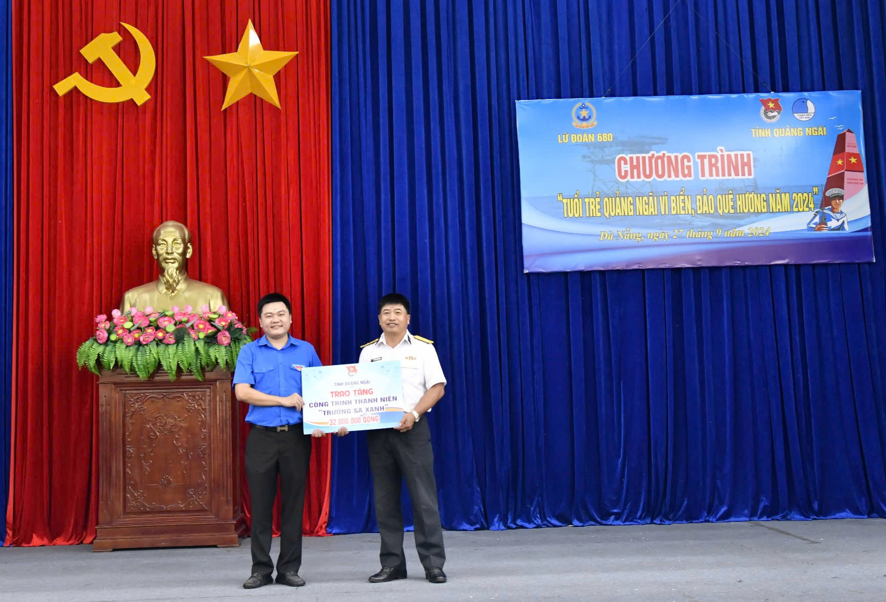 Đại diện Tỉnh đoàn Quảng Ngãi trao tặng công trình thanh niên "Trường Sa xanh" trị giá 32 triệu đồng