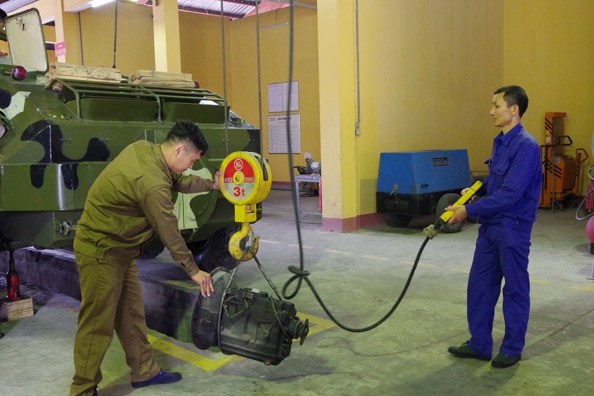 Thợ sửa chữa Trạm Sửa chữa tổng hợp phối hợp với kíp xe Tiểu đoàn 474 tổ chức bảo dưỡng, sửa chữa xe thiết giáp tại trạm. Ảnh: Đoàn Hiệp