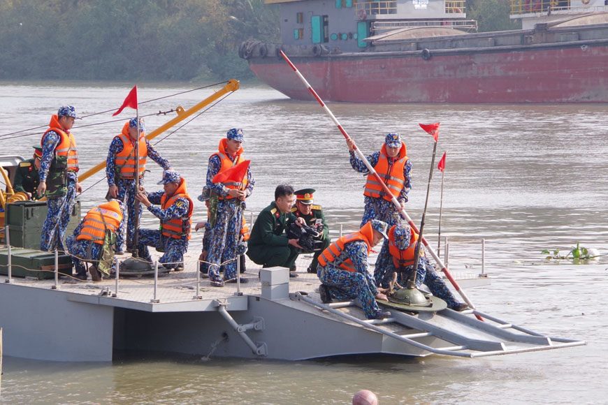 Chúng tôi đến thăm Đại đội 6, Lữ đoàn 131 vừa lúc anh em đang trong giờ huấn luyện vượt sông. Thiếu tá Vũ Quang Vinh, Đại đội trưởng, đang duy trì đơn vị luyện tập. Các chiến sĩ mặc áo phao, quần áo đều thấm ướt bởi phải lội nước đẩy xe xích xuống sông, với cường độ huấn luyện diễn ra rất khẩn trương. Sau những khẩu lệnh to, rõ, mạch lạc, những động tác dứt khoát, ở các vị trí từ lái xe đến tiểu đội trưởng, chiến sĩ đều thực hiện một cách thuần thục. Số phao và phương tiện kỹ thuật từ trên ô tô đã được hạ xuống bãi sông. Chỉ mươi phút sau, một chiếc xe xích đã sẵn sàng lội nước chở người, phương tiện qua sông có trọng tải lên đến chục tấn.