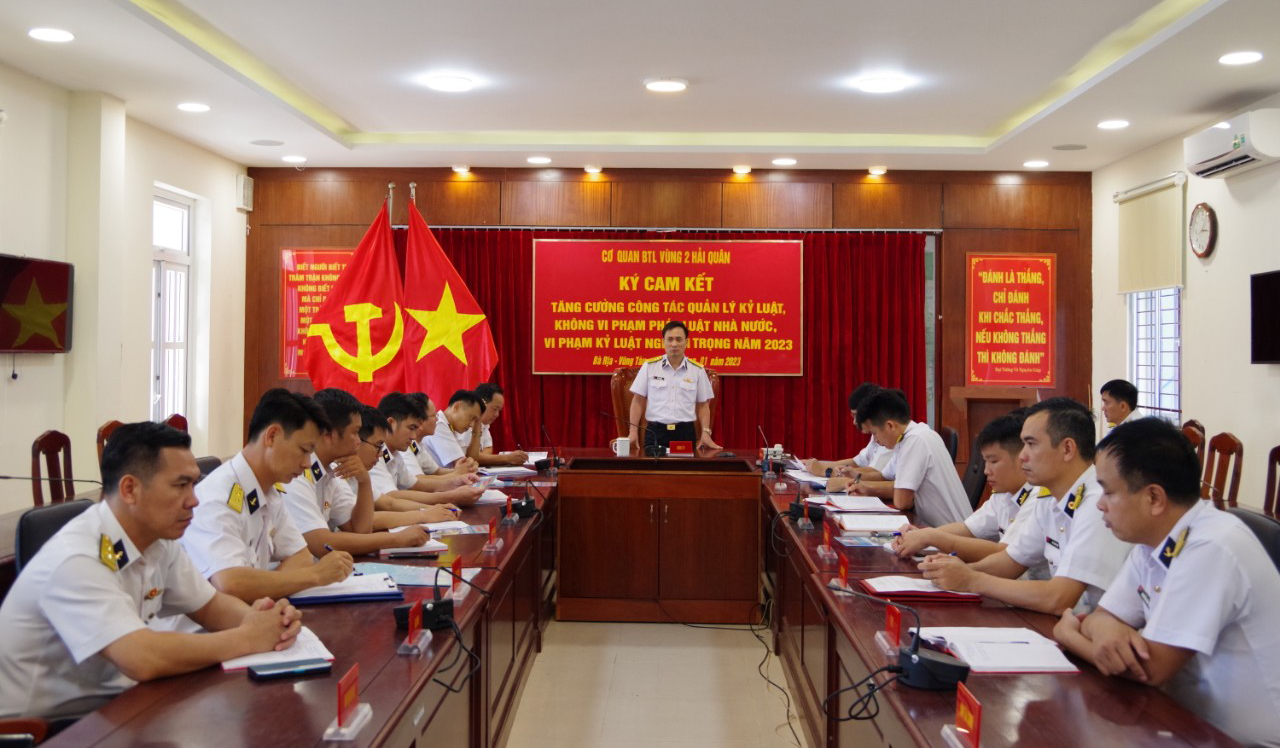 Ngày 12/1, tại TP. Vũng Tàu, tỉnh Bà Rịa - Vũng Tàu, khối cơ quan Bộ Tư lệnh Vùng 2 Hải quân tổ chức ký cam kết tăng cường công tác quản lý kỷ luật, không vi phạm pháp luật Nhà nước, kỷ luật nghiêm trọng năm 2023.