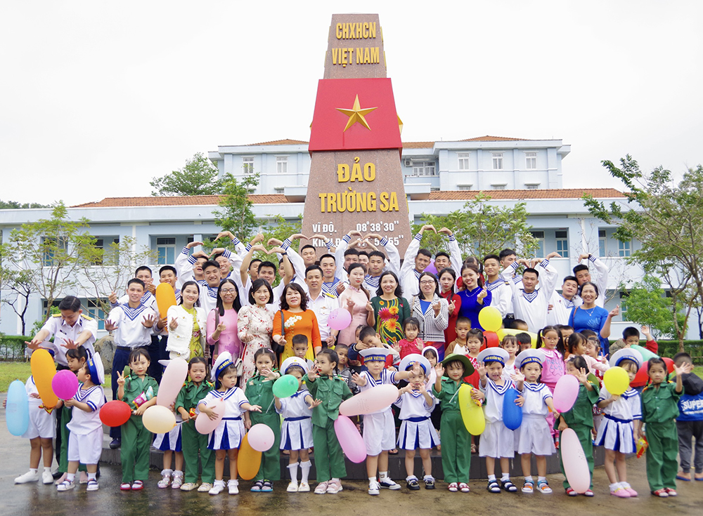 Chụp ảnh lưu niệm cùng cán bộ, chiến sĩ Lữ đoàn 682 bên mô hình cột mốc chủ quyền đảo Trường Sa