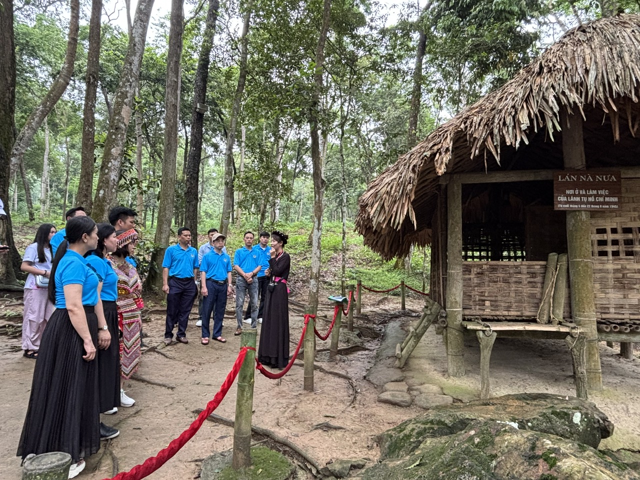 Cán bộ, đoàn viên nghe giới thiệu về lịch sử Lán Nà Nưa trong Khu di tích Quốc gia Tân Trào