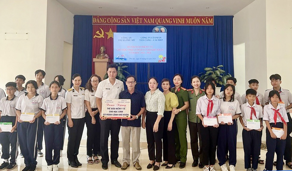 Ngày 3/1, tại thị xã Phú Mỹ (tỉnh Bà Rịa - Vũng Tàu), các tổ chức quần chúng (Công đoàn, thanh niên, phụ nữ) thuộc Công ty cổ phần (CP) Tân cảng Cái Mép, Tổng công ty Tân cảng Sài Gòn phối hợp với Công an thị xã Phú Mỹ, tỉnh Bà Rịa - Vũng Tàu tổ chức chương trình “Hỗ trợ bảo hiểm y tế cho học sinh có hoàn cảnh khó khăn, năm học 2023 - 2024” trên địa bàn xã Tân Hòa.