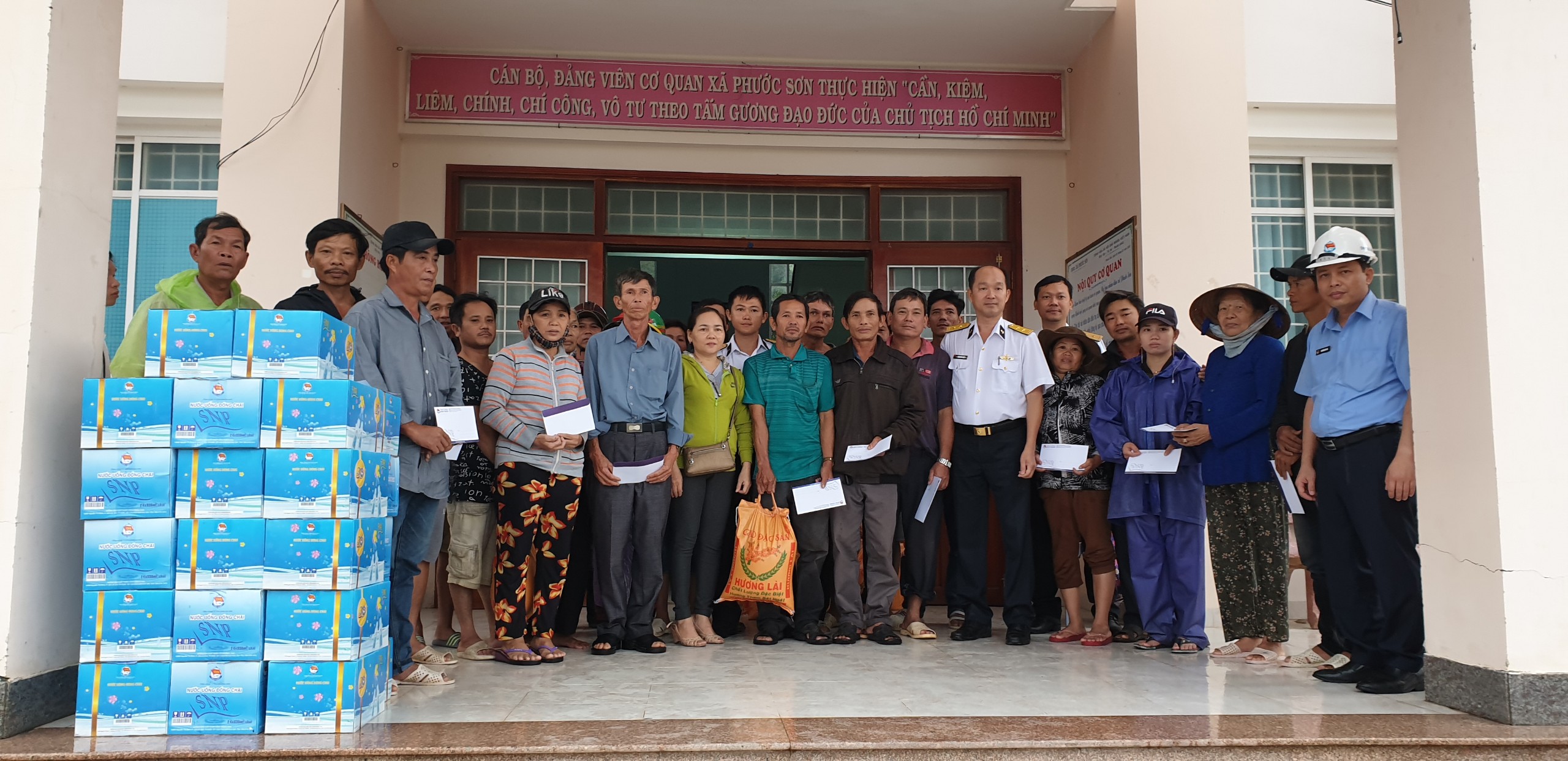Cán bộ, nhân viên Công ty đã quyên góp được gần 20 triệu đồng hỗ trợ 24 hộ dân thuộc xã Phước Sơn, huyện Tuy Phước, tỉnh Bình Định. Các hộ dân trên bị đổ, sập nhà trong cơn bão (Mỗi phần quà gồm 1 bao gạo 10kg, 1 thùng nước suối và 500 nghìn đồng).