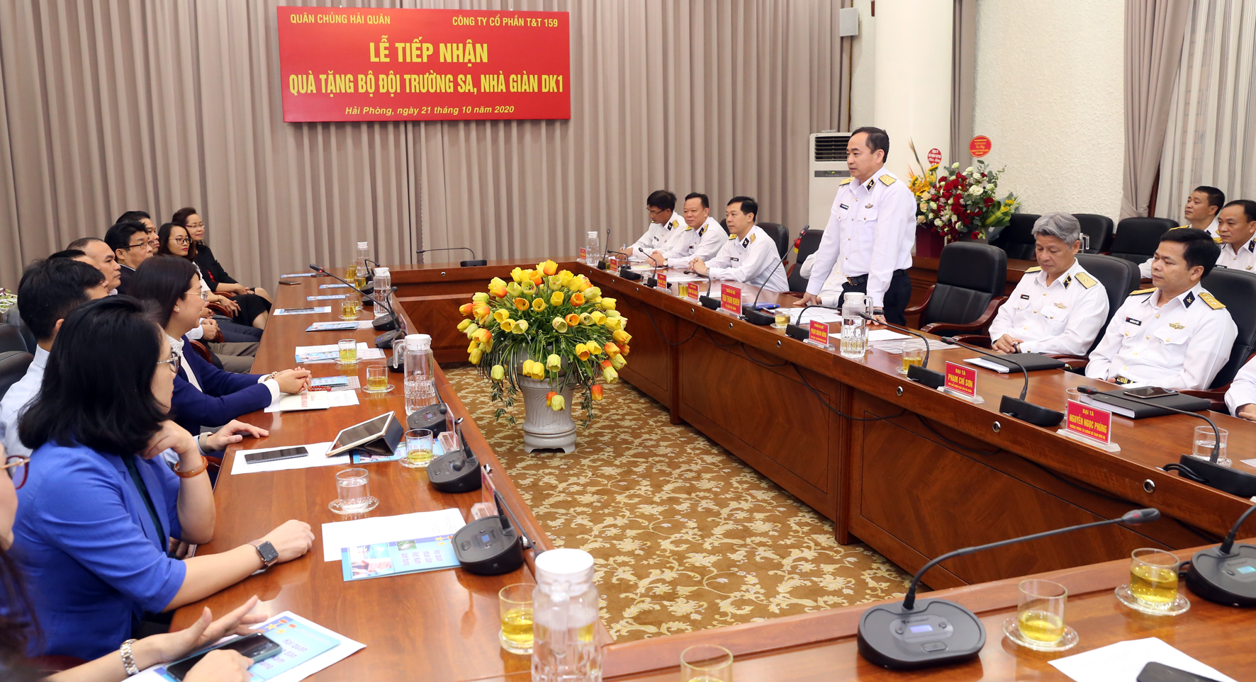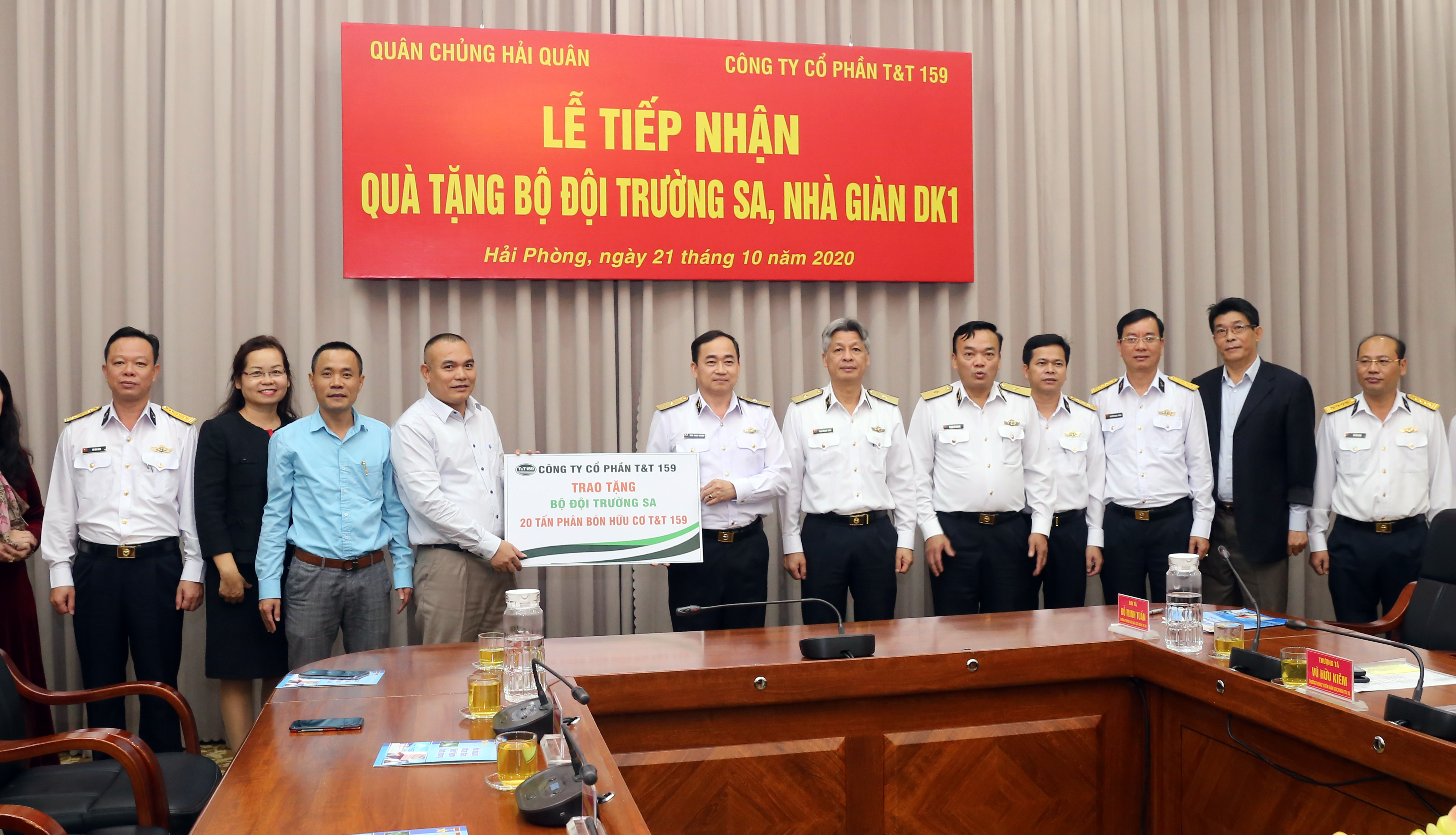 Sáng 21-10, tại TP. Hải Phòng, Quân chủng Hải quân tổ chức tiếp nhận quà của Công ty cổ phần T&T 159 và lãnh đạo Văn phòng Chính phủ gửi tặng cán bộ, chiến sĩ Trường Sa và Nhà giàn DK1. Chuẩn Đô đốc Trần Thanh Nghiêm, Tư lệnh Hải quân dự và tiếp nhận.