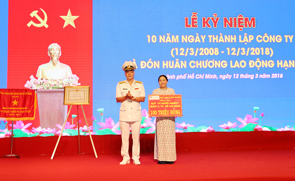 Đại diện Công ty CP Dịch vụ kỹ thuật Tân cảng trao 100 triệu đồng cho quỹ “Vì người nghèo” quận 2, TP. Hồ Chí Minh