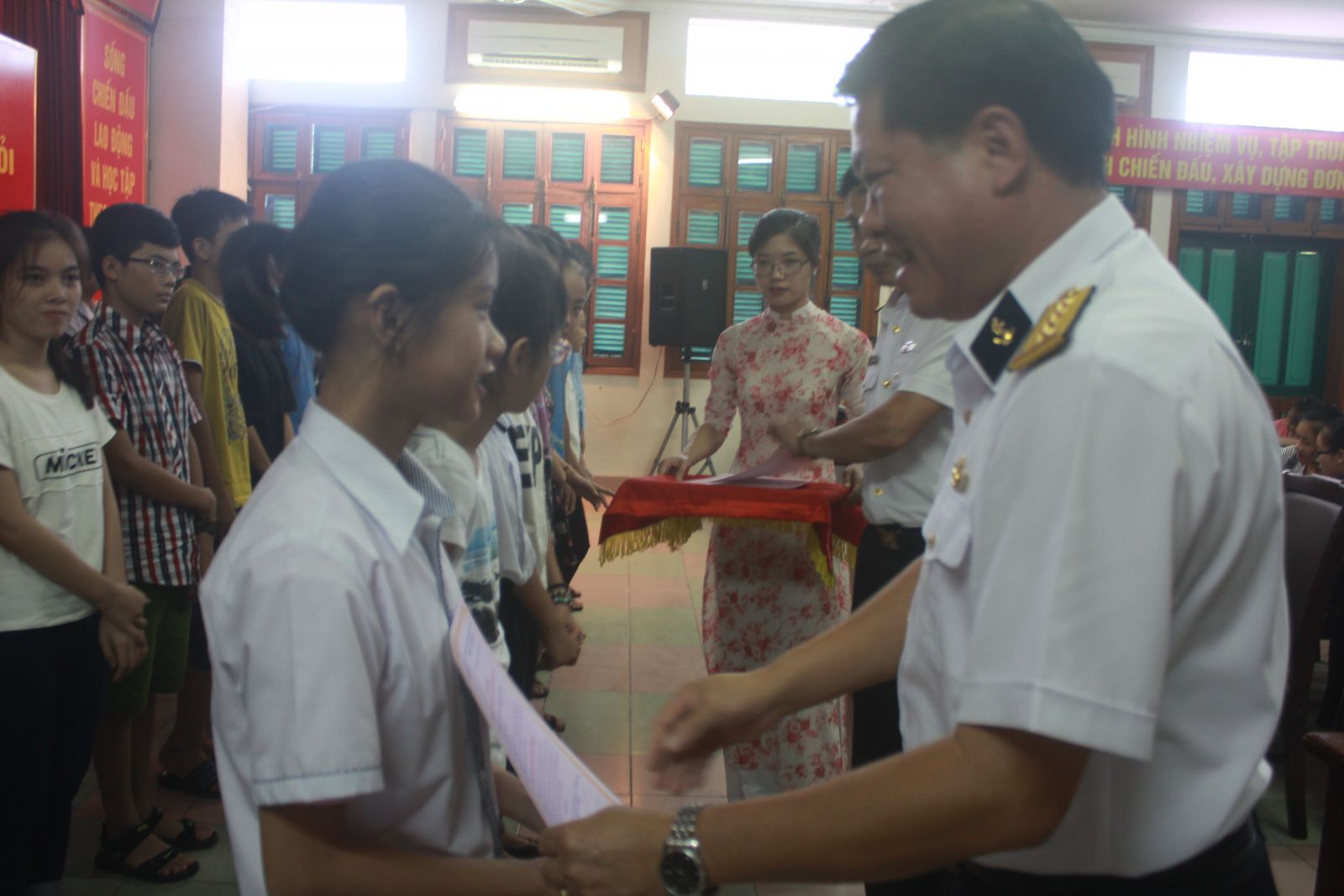 Thủ trưởng Cục Chính trị Hải quân trao thư khen của Đảng ủy, thủ trưởng Cục chính trị cho cho các cháu học sinh giỏi