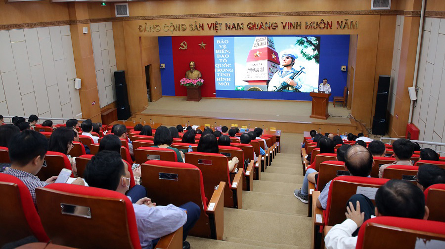 Cán bộ, nhân viên cơ quan TLĐ Lao động Việt Nam được nghe thông tin, giới thiệu về quá trình thành lập và phát triển của Hải quân Nhân dân Việt Nam; tình hình Biển Đông thời gian gần đây; vai trò nòng cốt của Hải quân Nhân dân Việt Nam trong sự nghiệp bảo vệ chủ quyền biển, đảo; công tác bảo vệ các hoạt động kinh tế biển, hướng dẫn ngư dân đánh bắt hải sản trên biển đúng quy định pháp luật và không vi phạm vùng biển nước ngoài...