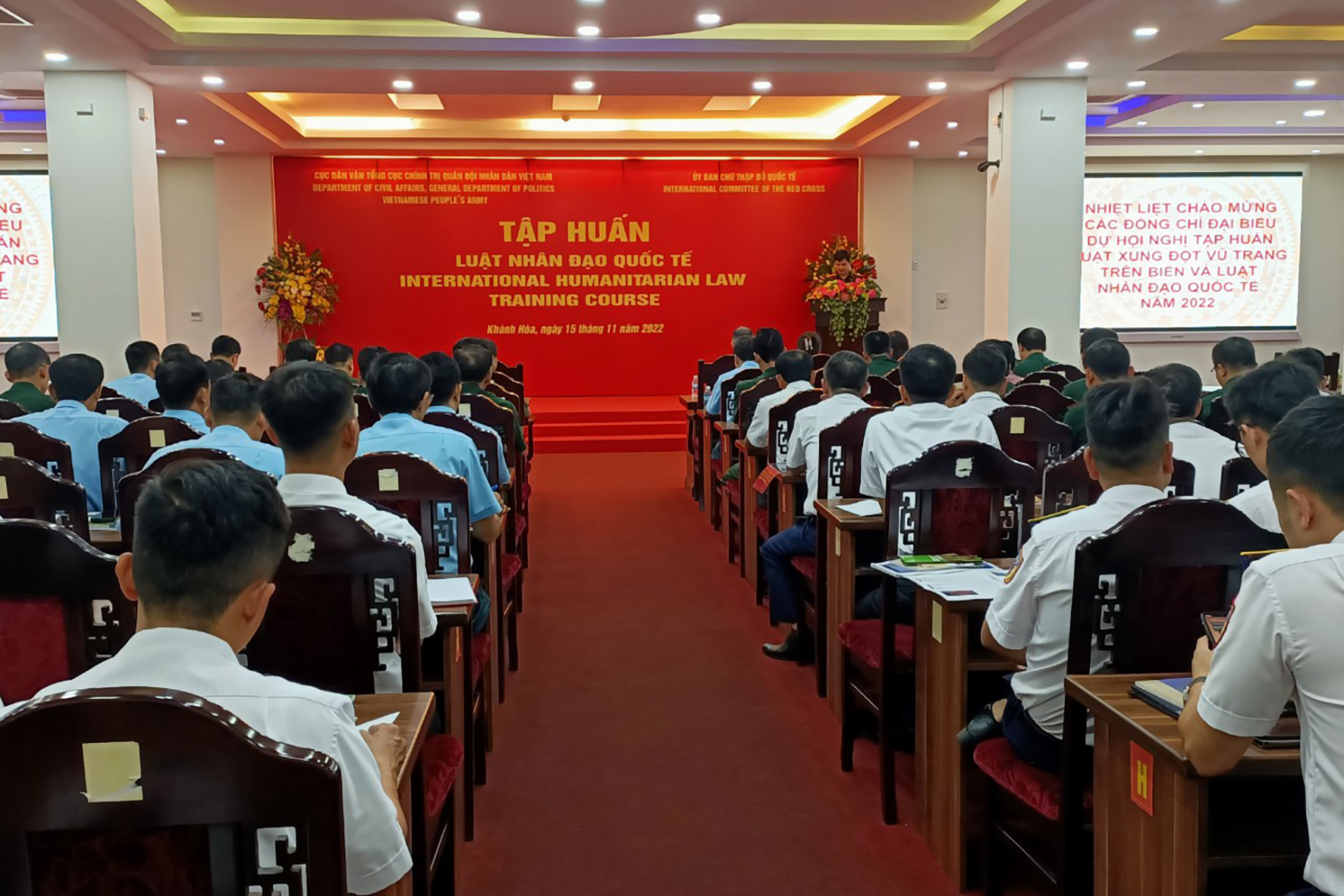 Sáng 15/11, tại TP. Nha Trang, tỉnh Khánh Hòa, Cục Dân vận, Tổng cục Chính trị Quân đội nhân dân Việt Nam phối hợp với Trung ương Hội Chữ thập đỏ Việt Nam và Ủy ban Chữ thập đỏ quốc tế khu vực Đông Nam Á tổ chức lớp tập huấn Luật Nhân đạo quốc tế.