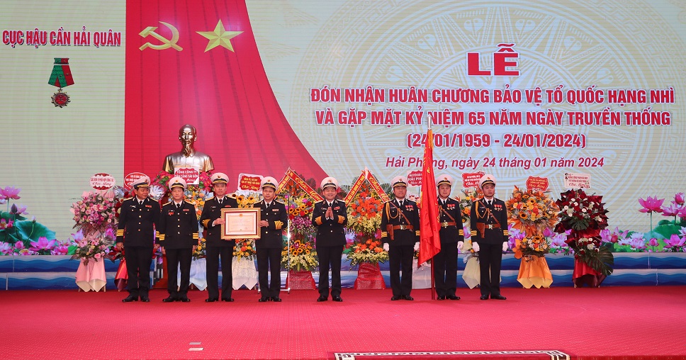 Sáng 24/1, tại Hải Phòng, Cục Hậu cần Hải quân tổ chức Lễ đón nhận Huân chương Bảo vệ Tổ quốc hạng Nhì và gặp mặt kỷ niệm 65 năm Ngày truyền thống (24/1/1959 - 24/1/2024). Tham dự buổi lễ có Trung tướng Nguyễn Văn Bổng, Bí thư Đảng ủy, Chính ủy Hải quân; thủ trưởng Tổng cục Hậu cần, Bộ Tư lệnh Hải quân; nguyên thủ trưởng Bộ Tư lệnh Hải quân; đại biểu các cơ quan, đơn vị trực thuộc Quân chủng; đại diện các cơ quan, đơn vị, doanh nghiệp trong và ngoài quân đội; đại biểu thủ trưởng, cán bộ, nhân viên Cục Hậu cần Hải quân các thời kỳ.