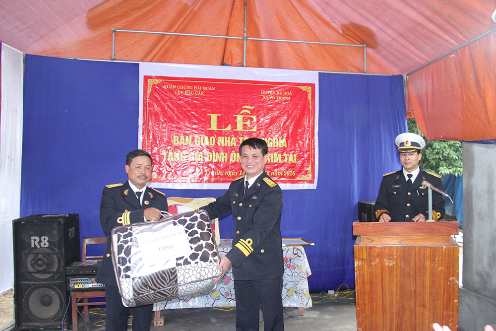 Tại lễ bàn giao, Cục Hậu cần Hải quân, các cơ quan đoàn thể và chính quyền địa phương đã trao tặng gia đình ông Tài một số vật dụng sinh hoạt thiết yếu.