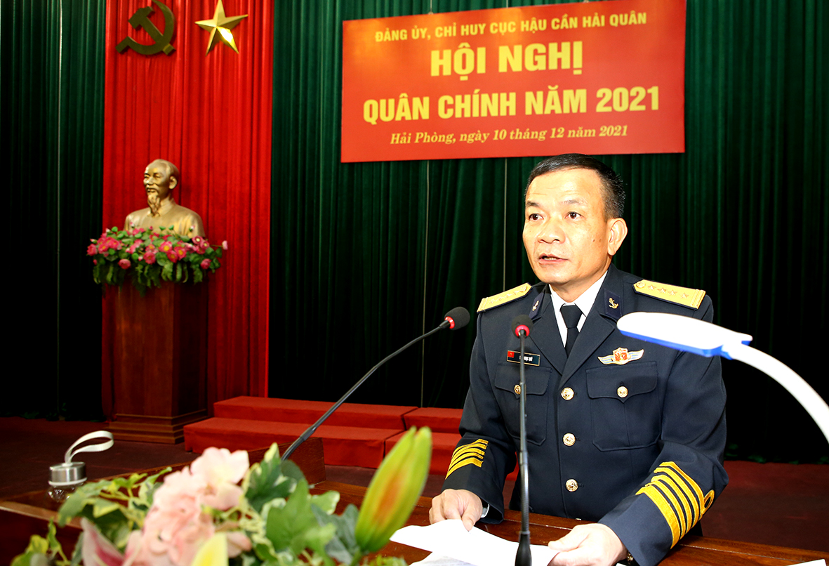 Đại tá Phạm Chí Sơn, Phó Cục trưởng Cục Hậu cần Hải quân chủ trì. Đại tá Đào Ngọc Quỳ, Bí thư Đảng ủy, Chính ủy Cục Hậu cần quát triệt nghị quyết lãnh đạo năm 2022.