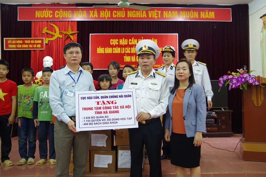 Nhân dịp này, Cục Hậu cần đã đến thăm và tặng các đối tượng chính sách xã hội thuộc Trung tâm công tác xã hội tỉnh Hà Giang 3.826 bộ quần áo, 2.155 bộ sách giáo khoa, đồ dùng học tập, 627 bộ đồ chơi trẻ em do cán bộ, chiến sĩ các cơ quan, đơn vị Cục Hậu cần Hải quân quyên góp ủng hộ.