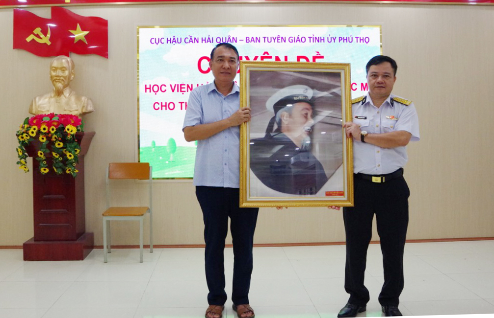 Thủ trưởng Phòng Chính trị, Cục Hậu cần Hải quân tặng trường THPT Yến Khê ảnh Bác Hồ