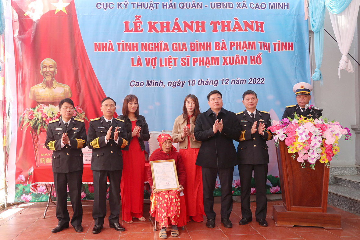 Sáng 19/12, Cục Kỹ thuật Hải quân phối hợp với UBND xã Cao Minh, huyện Vĩnh Bảo, TP. Hải Phòng tổ chức khánh thành và bàn giao nhà tình nghĩa tặng bà Phạm Thị Tình trú tại Xóm 1, xã Cao Minh.