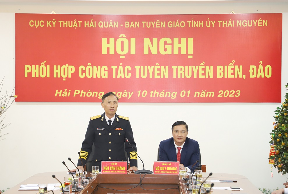 Chiều 10/1, tại Hải Phòng, Cục Kỹ thuật Hải quân và Ban Tuyên giáo Tỉnh ủy Thái Nguyên tổ chức Hội nghị phối hợp công tác tuyên truyền biển, đảo năm 2023. Đại tá Ngô Văn Thành, Bí thư Đảng ủy, Chính ủy Cục Kỹ thuật và đồng chí Vũ Duy Hoàng, Ủy viên Ban Thường vụ, Trưởng ban Tuyên giáo Tỉnh ủy Thái Nguyên đồng chủ trì.