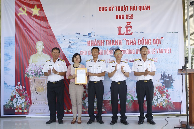 Tại lễ khánh thành, thủ trưởng Cục Kỹ thuật, Kho 858, đại diện chính quyền địa phương, hàng xóm và đồng đội tặng gia đình Thượng úy QNCN Lê Văn Việt quà và một số vật dụng thiết yếu.