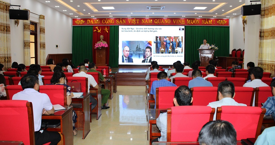 Tham dự hội nghị có gần 400 đồng chí là trưởng phó các phòng, ban, đoàn thể; cán bộ báo cáo viên cấp huyện; cấp ủy các chi bộ, đảng bộ. Thượng tá Nguyễn Xuân Sang, Phó Chủ nhiệm Chính trị, Cục Kỹ thuật Hải quân đã giới thiệu chuyên đề “Tình hình Biển Đông thời gian gần đây và kết quả xây dựng Quân chủng Hải quân hiện đại, bảo vệ vững chắc chủ quyển biển, đảo tình hình hiện nay”. Nội dung chuyên đề gồm vị trí, vai trò, tầm quan trọng của biển, đảo đối với sự nghiệp xây dựng và bảo vệ Tổ quốc; tình hình thế giới, khu vực tác động đến tình hình Biển Đông; động thái của các nước với Biển Đông; kết quả xây dựng và thực hiện nhiệm vụ của Quân chủng Hải quân trong thời gian qua...