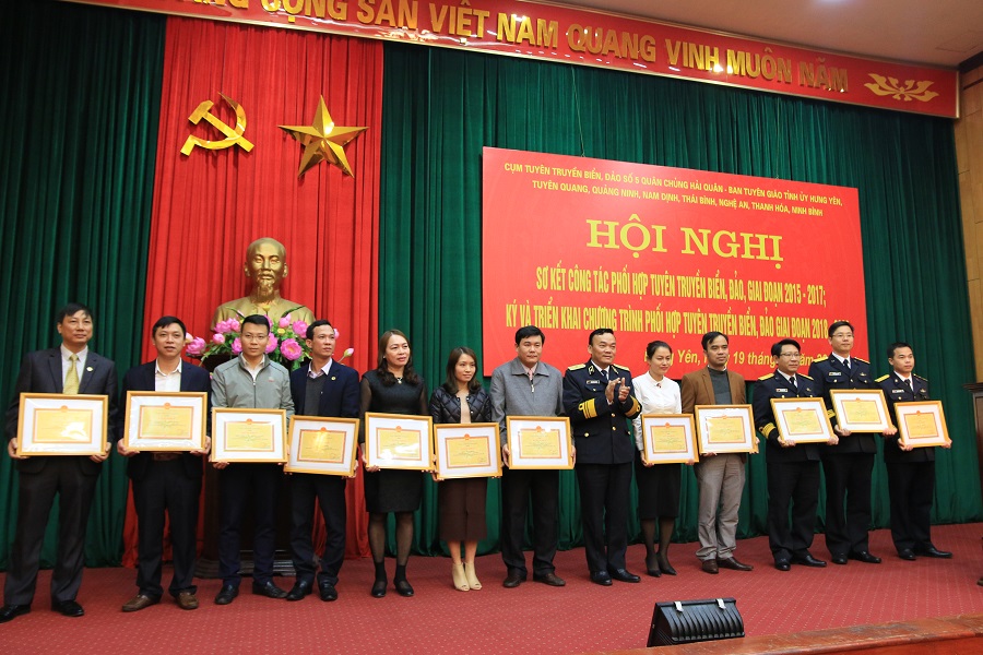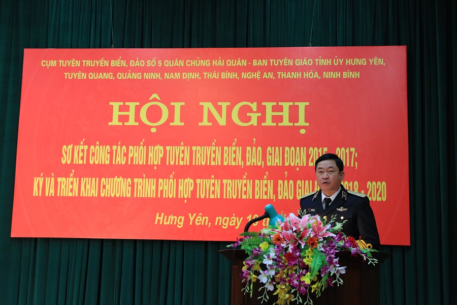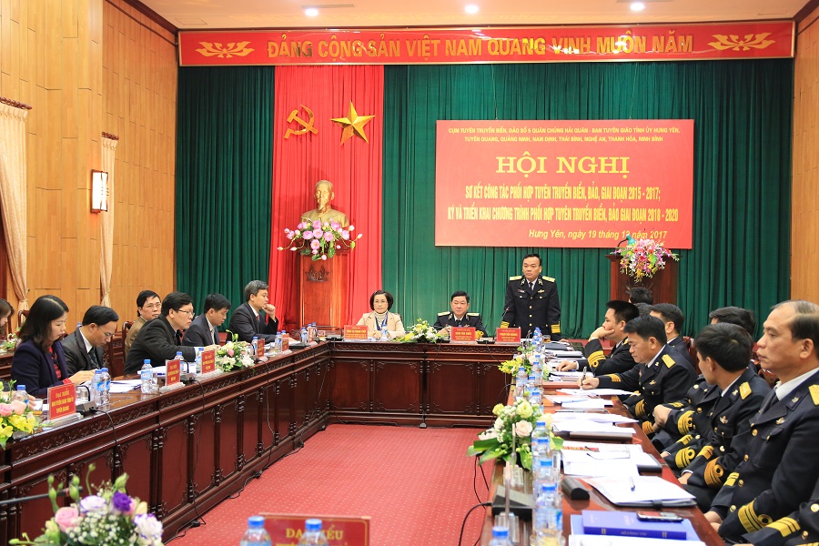 Ngày 19-12, tại TP. Hưng Yên, Cụm tuyên truyền biển, đảo số 5 Quân chủng Hải quân cùng các tỉnh Hưng Yên, Quảng Ninh, Thái Bình, Nam Định, Ninh Bình, Thanh Hóa, Nghệ An, Tuyên Quang đã tổ chức Hội nghị sơ kết công tác phối hợp tuyên truyền biển, đảo (TTBĐ) giai đoạn 2015-2017. Chuẩn Đô đốc Đoàn Văn Chiều, Phó Chủ nhiệm Chính trị Hải quân; đồng chí Đỗ Xuân Tuyên, Phó Bí thư Thường trực Tỉnh ủy, Chủ tịch Hội đồng nhân dân tỉnh Hưng Yên chủ trì hội nghị.