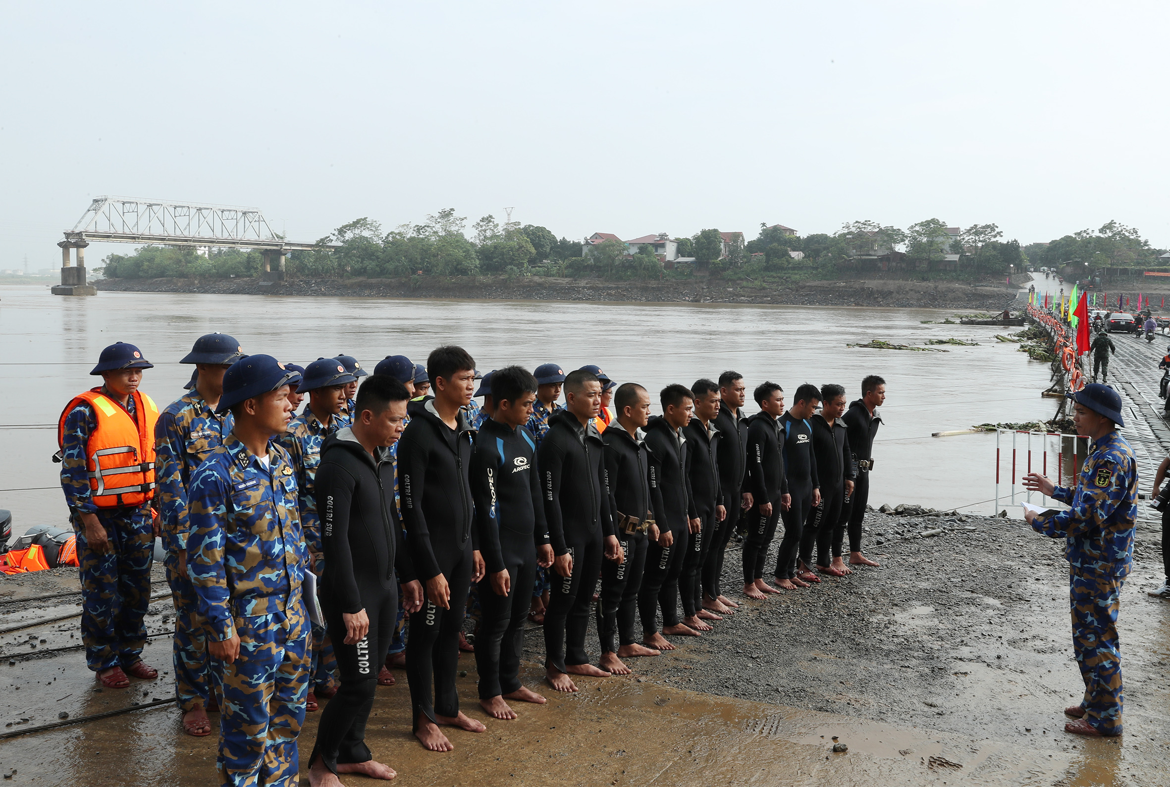 Thợ lặn được trang bị khí tài chuyên dụng, đi trên xuồng cứu nạn xuất phát từ vị trí cầu phao mới, tổ chức lặn tìm kiếm xung quanh khu vực cầu sập. Trong quá trình tìm kiếm thợ lặn của Đặc công Hải quân luôn phối hợp, hiệp đồng chặt chẽ với các lực lượng có mặt trên hiện trường.