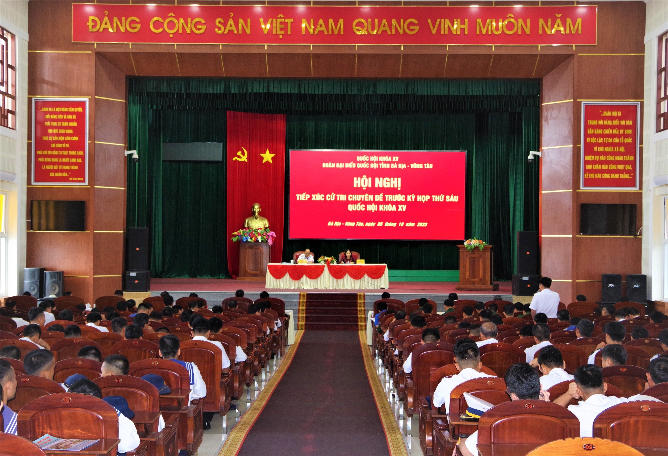 Chiều 5/10, tại Hội trường Bộ Tư lệnh Vùng 2 Hải quân (TP. Vũng Tàu, tỉnh Bà Rịa – Vũng Tàu) đoàn đại biểu Quốc hội (ĐBQH) tỉnh gồm các đồng chí: Nguyễn Thị Yến, Phó Bí thư Thường trực Tỉnh ủy, Trưởng đoàn ĐBQH tỉnh, Phó Chủ tịch Nhóm nữ ĐBQH; Chuẩn Đô đốc Đỗ Văn Yên, Phó Chính ủy Quân chủng Hải quân đã có buổi tiếp xúc cử tri chuyên đề với các lực lượng vũ trang trên địa bàn (Bộ Tư lệnh Vùng 2 Hải quân, Bộ Tư lệnh Vùng Cảnh sát biển 3, Bộ Chỉ huy Bộ đội biên phòng tỉnh) trước kỳ họp thứ Sáu, Quốc hội Khóa XV.