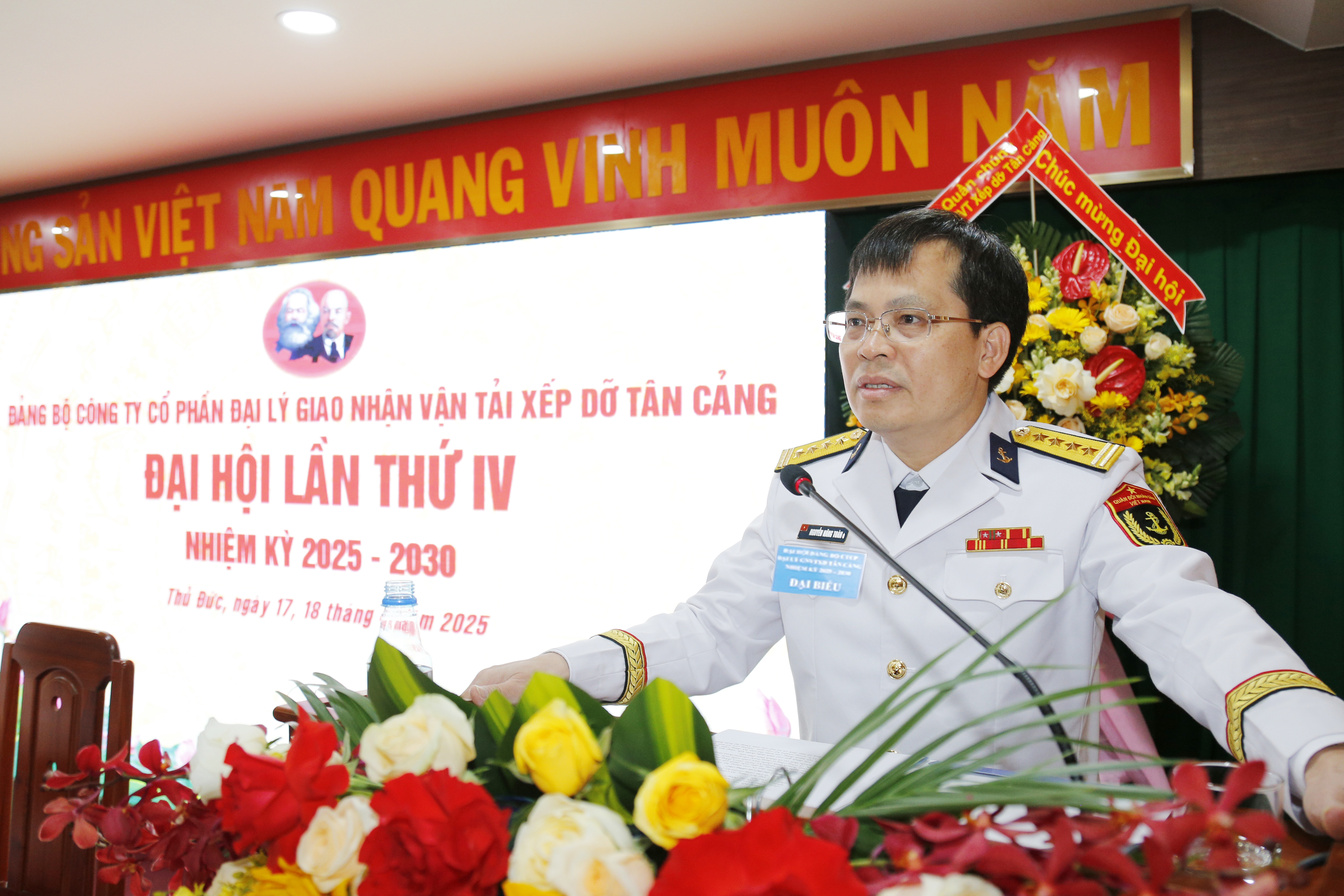 Phát biểu chỉ đạo đại hội, Đại tá Nguyễn Năng Toàn đánh giá cao tinh thần đoàn kết, sáng tạo, kỷ luật và quyết liệt hành động của toàn thể cán bộ, đảng viên, người lao động Công ty CP Đại lý giao nhận vận tải xếp dỡ Tân cảng trong nhiệm kỳ vừa qua.