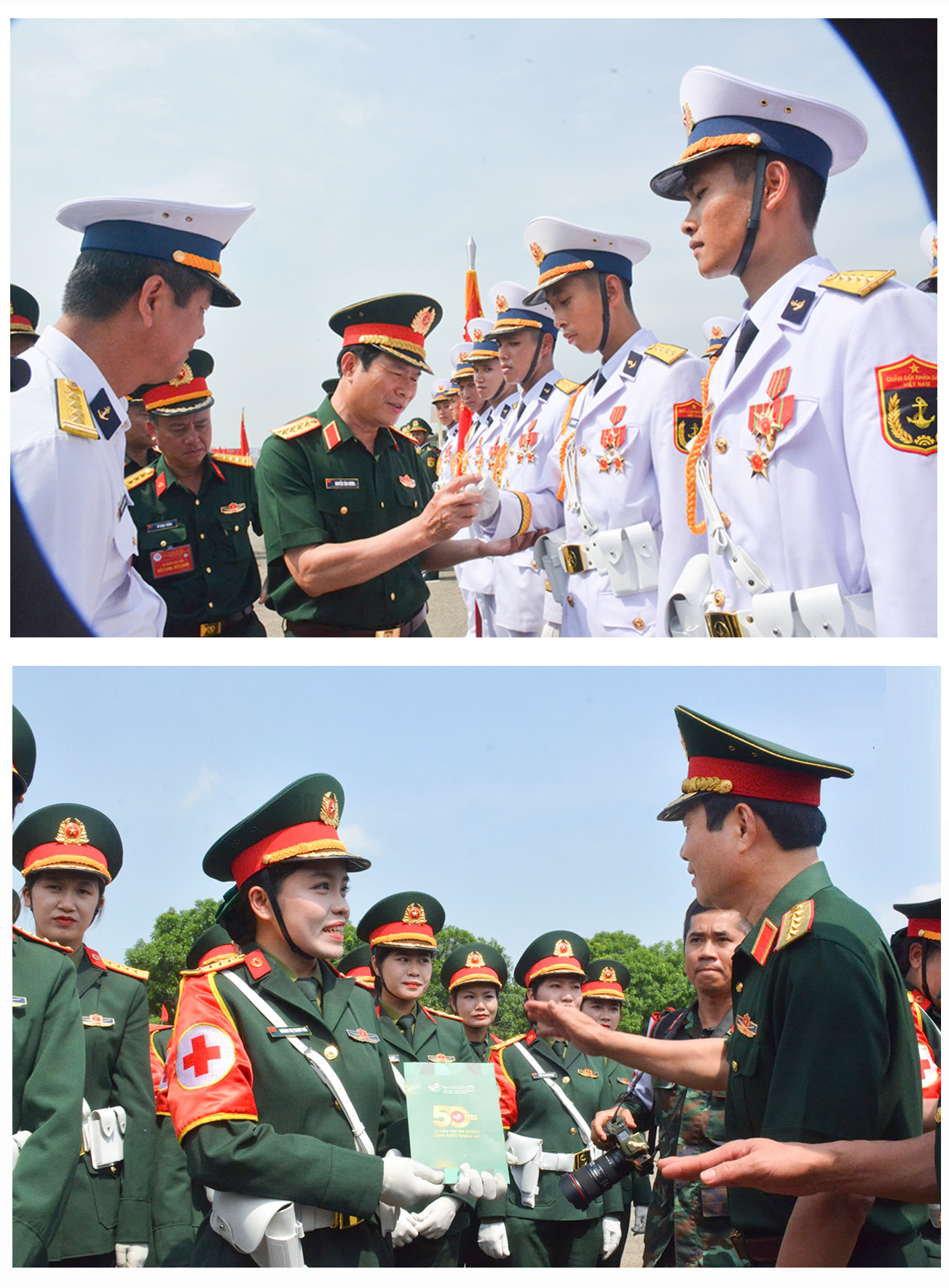 Đại tướng Nguyễn Tân Cương đã ân cần hỏi thăm, động viên và tặng quà các chiến sĩ tham gia các khối diễu hành, diễu binh.