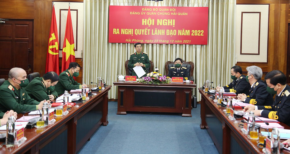 Sáng 23/12, tại Hải Phòng, Đại tướng Phan Văn Giang, Ủy viên Bộ Chính trị, Phó Bí thư Quân ủy Trung ương, Bộ trưởng Bộ Quốc phòng dự và chỉ đạo Hội nghị ra Nghị quyết lãnh đạo nhiệm vụ năm 2022 của Đảng ủy Quân chủng Hải quân.