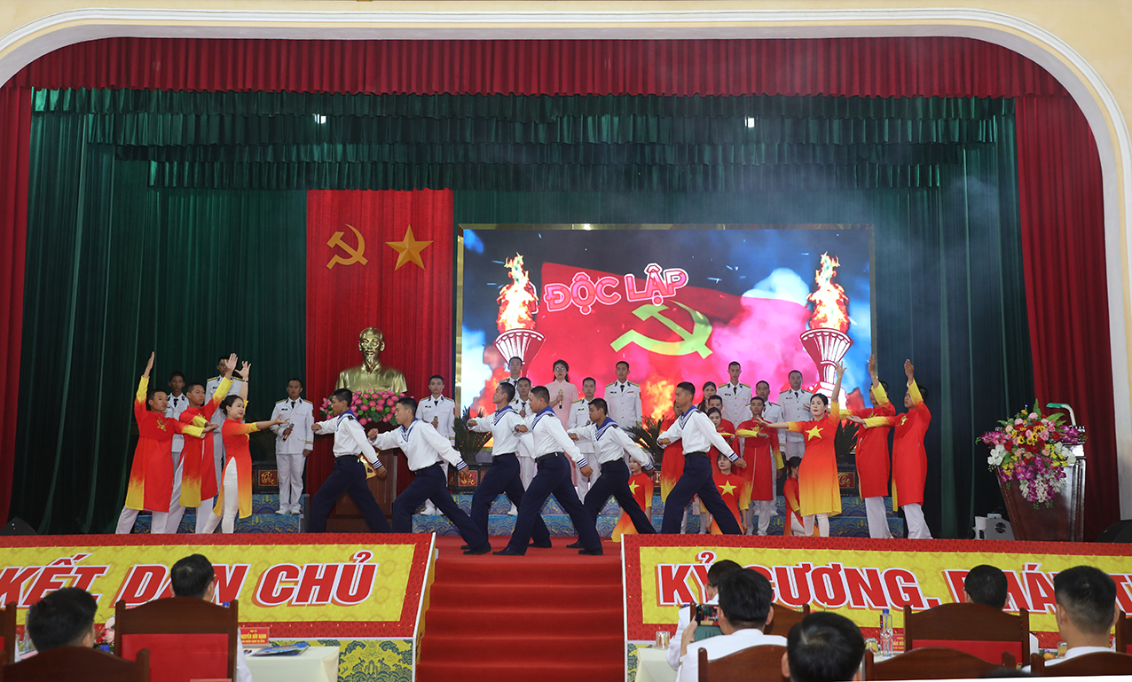 Chuẩn Đô đốc Trần Xuân Văn tặng hoa chúc mừng Ban chấp hành Đảng bộ Lữ đoàn 147 nhiệm kỳ mới và đoàn đại biểu dự đại hội cấp trên