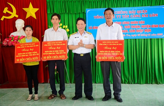 Lãnh đạo Tổng công ty Tân cảng Sài Gòn trao tượng trưng bồn nước tặng nhân dân huyện Bình Đại, tỉnh Bến Tre. Ảnh: CTV