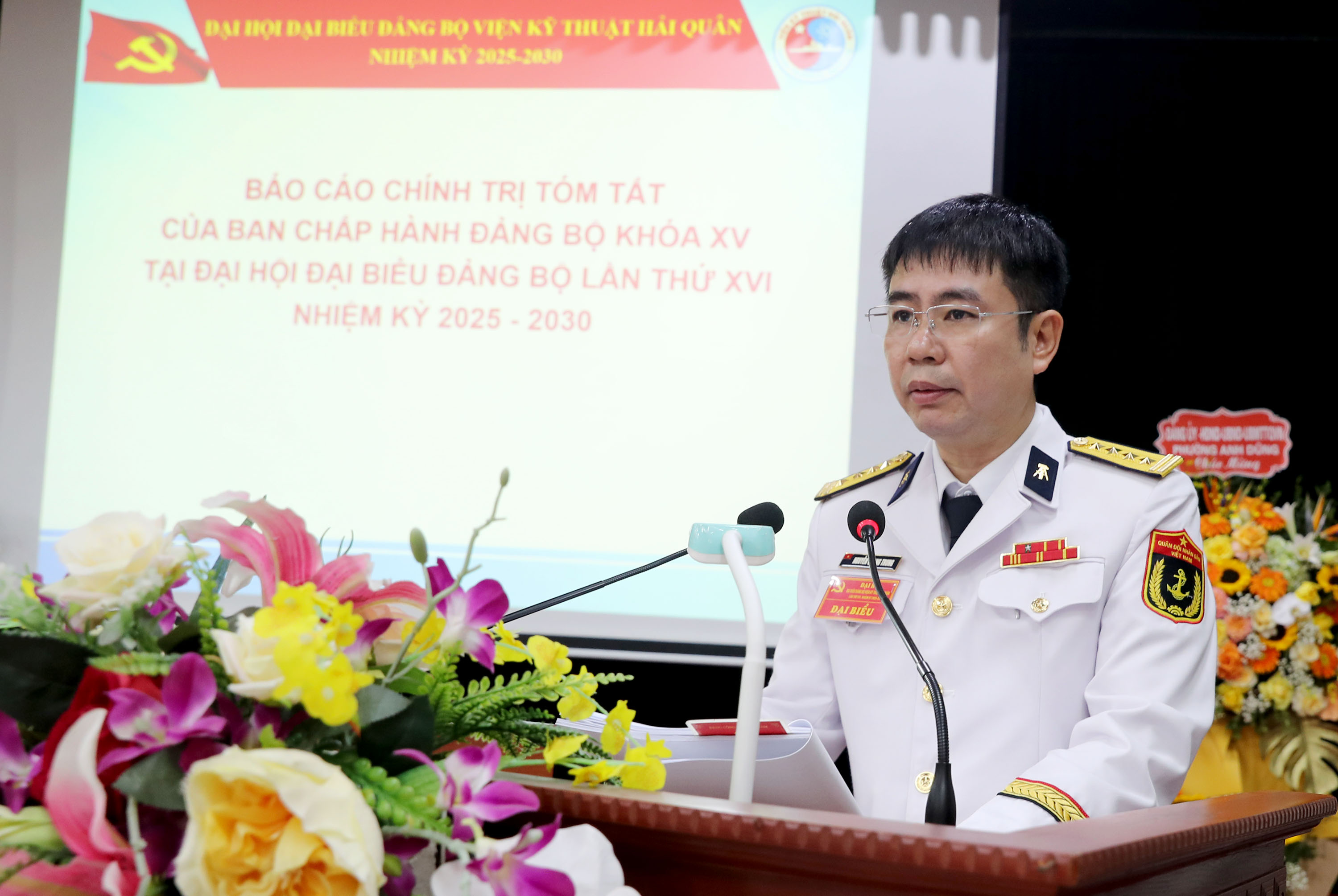 Đại tá Nguyễn Quang Trung, Phó Bí thư Đảng ủy, Viện trưởng Viện Kỹ thuật Hải quân trình bày báo cáo chính trị