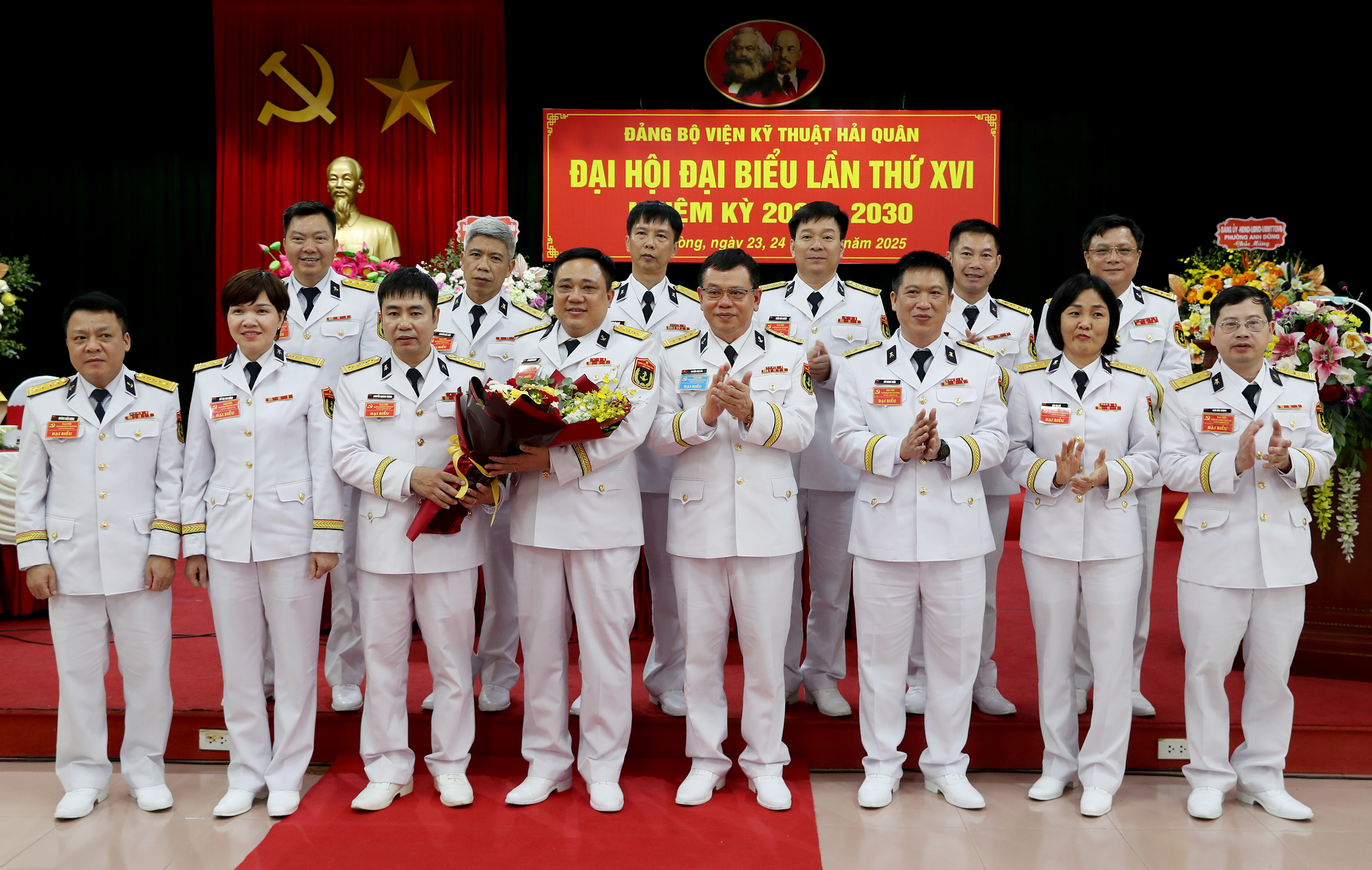 Đại tá Nguyễn Như Hải, Phó Chủ nhiệm Hậu cần-Kỹ thuật Hải quân tặng hoa chúc mừng Ban chấp hành Đảng bộ Viện Kỹ thuật nhiệm kỳ mới và đoàn đại biểu dự Đại hội đại biểu Đảng bộ Quân chủng Hải quân lần thứ XIV