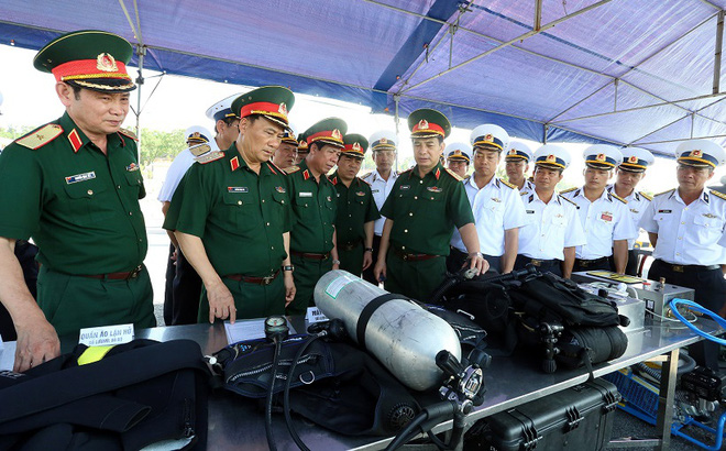 Thượng tướng Phan Văn Giang kiểm tra trang bị lặn tại Lữ đoàn 126 Hải quân. Ảnh: PV