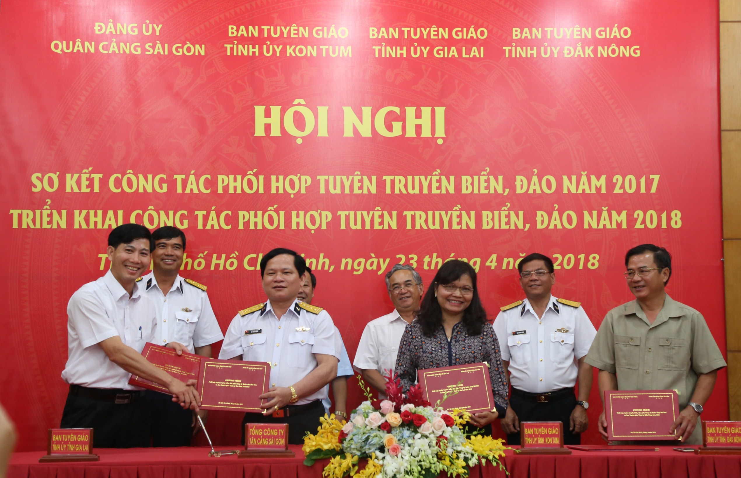 Chiều 23-4, tại cảng Tân cảng Cát Lái, Đảng ủy Quân cảng Sài Gòn (QCSG) cùng Ban Tuyên giáo Tỉnh ủy Kon Tum, Gia Lai, Đắk Nông đã tổ chức sơ kết công tác phối hợp tuyên truyền biển, đảo (TTBĐ) năm 2017 và ký kết chương trình phối hợp TTBĐ năm 2018.