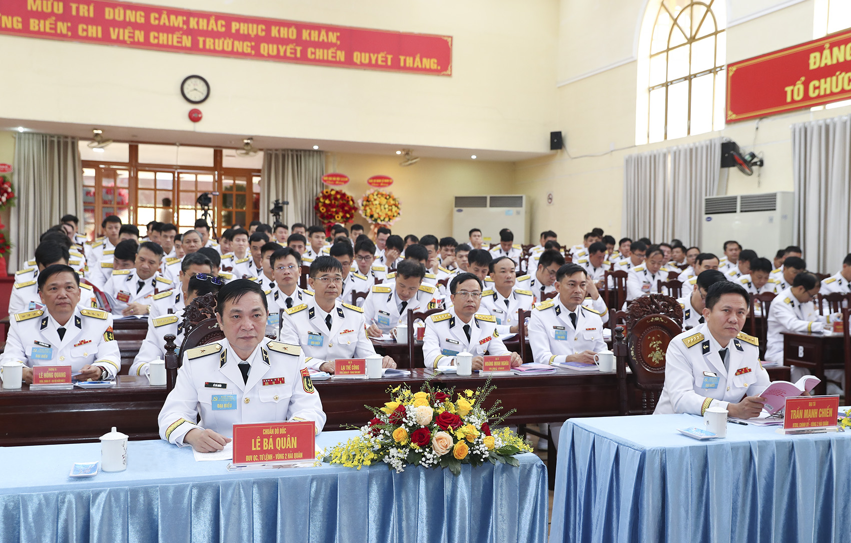 Chuẩn Đô đốc Lê Bá Quân và Đại tá Trần Mạnh Chiến tặng hoa chúc mừng Ban chấp hành Đảng bộ Lữ đoàn nhiệm kỳ mới và đại biểu đi dự Đại hội đại biểu Đảng bộ Vùng 2
