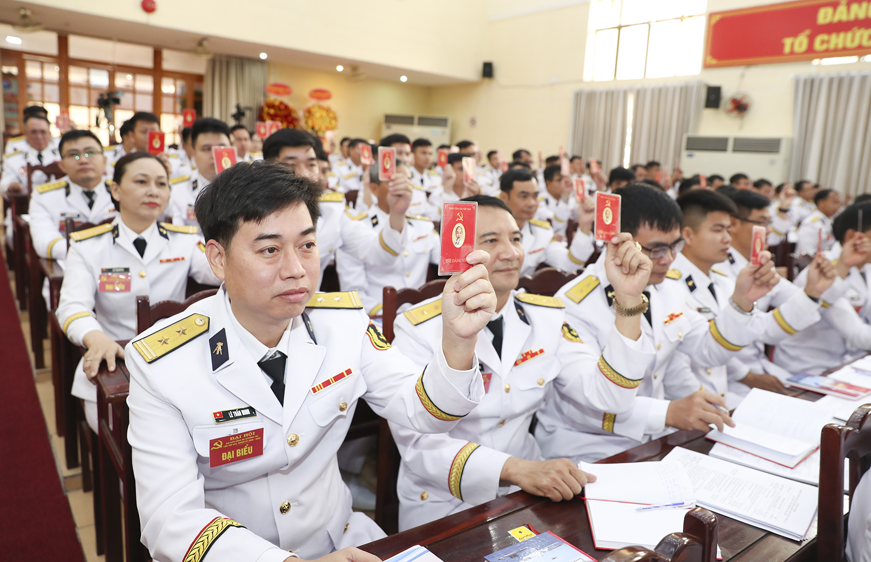 Đại hội biểu quyết nội dung kết luận thảo luận vào Dự thảo báo cáo chính trị của Đảng ủy Vùng 2 và Đảng ủy Quân chủng Hải quân nhiệm kỳ 2025-2030