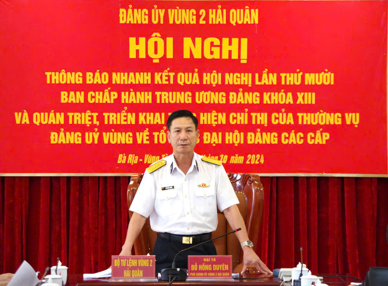 Chiều 7/10, tại thành phố Vũng Tàu, tỉnh Bà Rịa - Vũng Tàu, Đảng ủy Vùng 2 Hải quân tổ chức thông báo kết quả Hội nghị lần thứ 10, Ban Chấp hành Trung ương Đảng Khóa XIII bằng hình thức trực tuyến từ Hội trường Bộ Tư lệnh Vùng tới 3 điểm cầu các đơn vị trong toàn Vùng. Đại tá Đỗ Hồng Duyên, Ủy viên Ban Thường vụ Đảng ủy, Phó Chính ủy Vùng chủ trì.