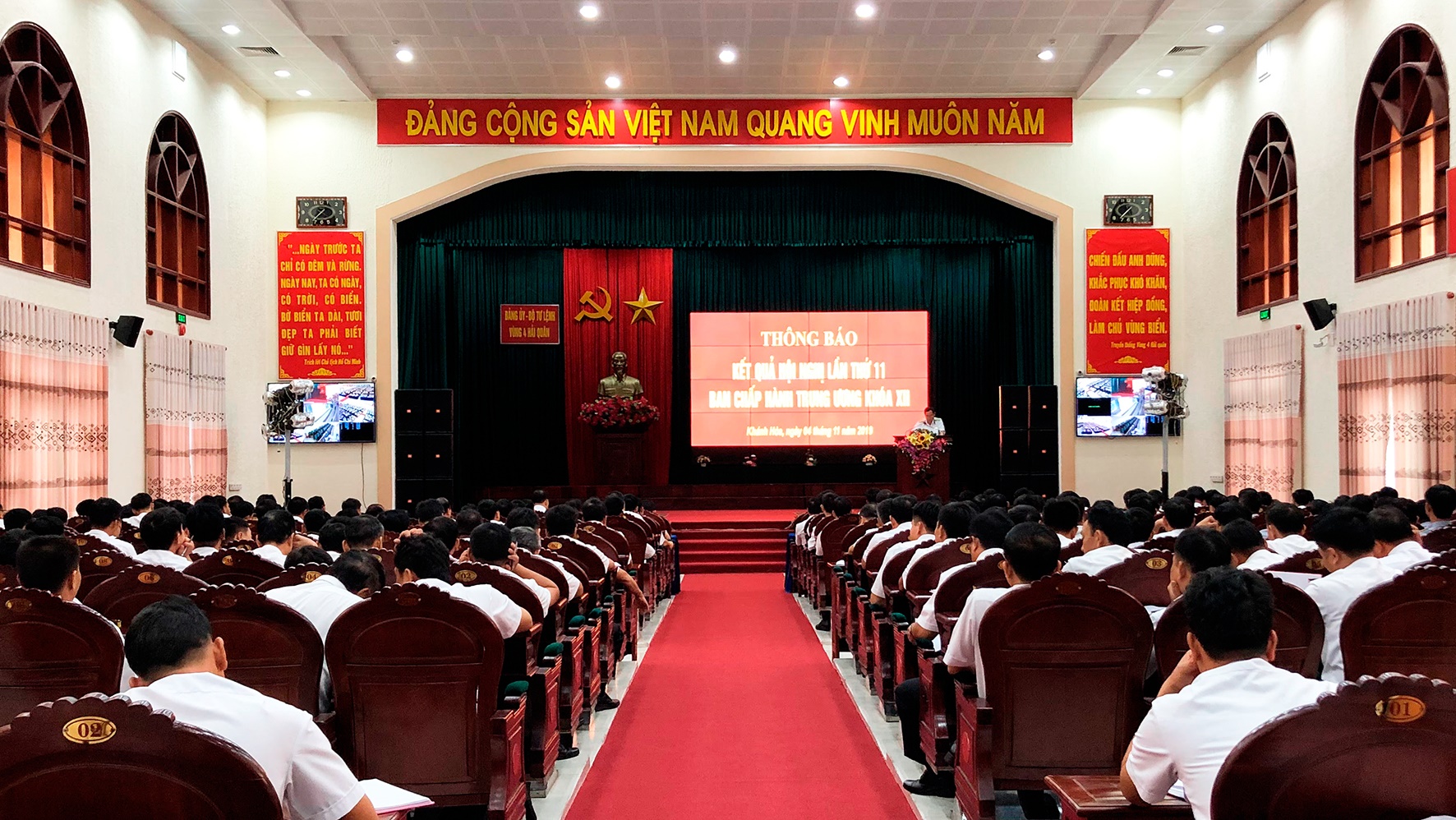 Sáng 4-11, tại TP. Cam Ranh, tỉnh Khánh Hòa, Đảng uỷ Vùng 4 Hải quân tổ chức Hội nghị thông báo kết quả Hội nghị lần thứ 11, Ban Chấp hành Trung ương Đảng Khóa XII cho hơn 400 đồng chí là cán bộ chủ trì, sĩ quan cấp tá của các cơ quan, đơn vị.