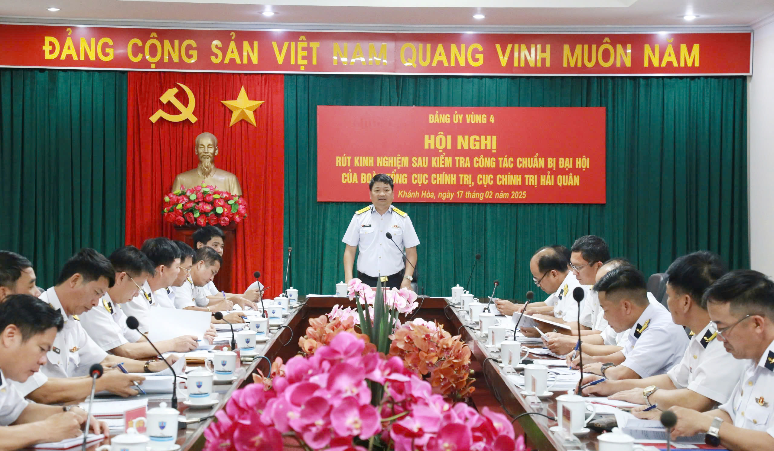 Sáng 17/2, tại TP. Cam Ranh, tỉnh Khánh Hòa, Đảng ủy, Bộ Tư lệnh Vùng 4 Hải quân tổ chức hội nghị rút kinh nghiệm sau kiểm tra công tác chuẩn bị đại hội các cấp trong Đảng bộ Vùng của Tổng cục Chính trị và Cục Chính trị Hải quân. Thượng tá Bùi Xuân Bình, Bí thư Đảng ủy, Chính ủy Vùng chủ trì.
